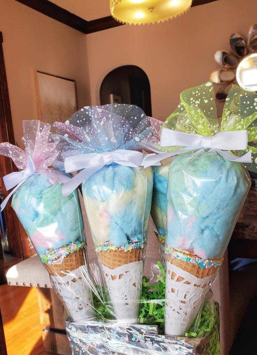 A truly delightful gift for the kiddos, a delicious combination of cotton candy & Ice Cream Cones Great gift idea to send your loved ones! 10 Ice Cream Cones with Cotton candies Ice Cream Cones covered with white doilies & sprinkles. Colorful Cotton Candy Tied with bows & Pastel mesh. All candies are factory made. candies may be substituted depending on availability Will ship via USPS Priority mail. Please inform me of the date these treats are needed by so I can create them & ship them accordingly. Please note I cannot be held responsible for lost, stolen or damaged items Also if you live in a state than is very hot & humid I recommend you purchase candy kabobs without cotton candy as it is fragile & can dry up. Any questions or concerns please feel free to contact me. 10 Ice Cream Cone Cotton Candy