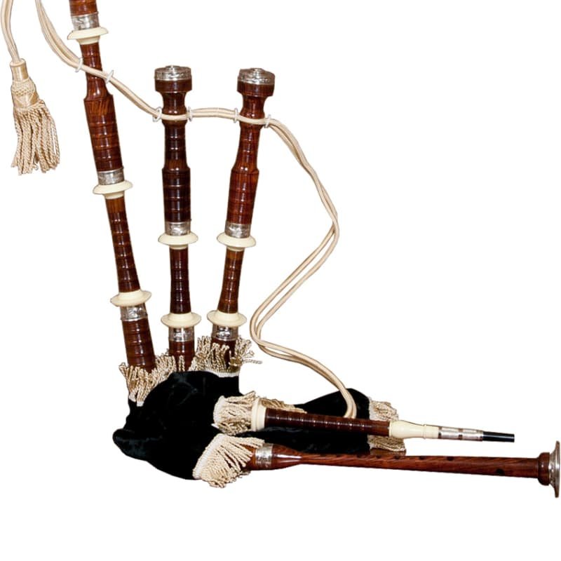 Black velvet cover with Rexine bag, engraved ferrules, and sole with imitation ivory mounts. This Roosebeck Bagpipe set has a Rexine bag. Rexine is…