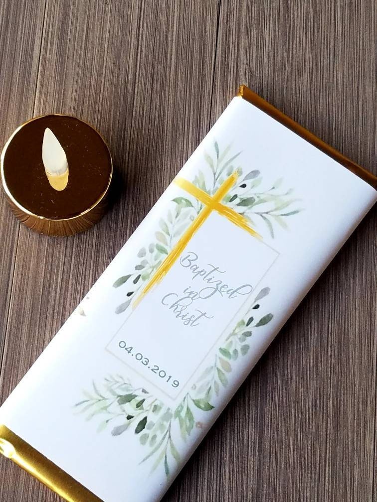 These chocolates are perfect for celebrating your religious event! Pictures don’t do them justice! Wording can be changed if desired. LISTING OPTIONS: $25 – Includes one set of 10 chocolates with gold foil & custom wrappers $19.00 – Includes 10 wrappers & 10 foils only! NO HERSHEYS! ORDERING: Include personalization wording under “NOTE TO SELLER” section during checkout. We will send you a proof within 48 hours for approval. Missing or incomplete information will cause delay so please respond promptly. If you need more than the listed quantity, send me a message so I can set you up. If you need labels rushed you can add production rush fee of $20 under shipping upgrades. This is production overnight rush, not overnight shipping. Overnight shipping can be quoted upon request. It varies by location. we cannot ship chocolates internationally…only wrappers CONTACT US: Don’t hesitate to contact us with any questions or additional requests. LAST BUT NOT LEAST…CHECK OUT MY OTHER ITEMS Baptism Chocolate Favors Gold Cross, Geometric Frame | Set Of 10