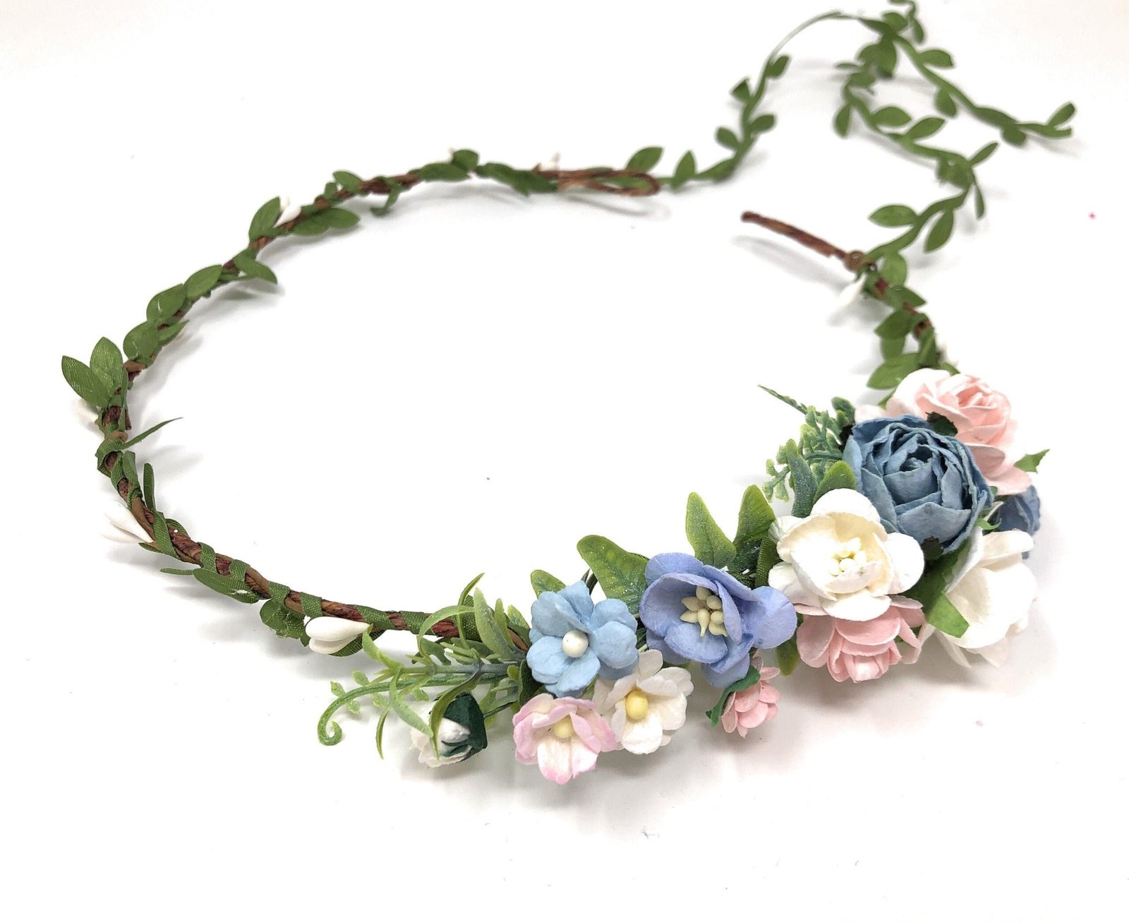This light blue & light pink flower crown is made from flowers, green leaf cord & tiny wire pip berries. The two ends join in the back with long, white satin ribbon so it fits to any size. The halo crown is a simply beautiful piece suitable for brides, flower girls, bridesmaids. This rustic headband is also perfect for an outdoor picnic to have nice photo shoots. NOTE: The floral crown is made with covered wire so use it carefully. Please supervise your child. I can not be responsible for any incident that may happen during wearing this crown. Blue Flower Crown Wedding Floral Headband With Satin Ribbon