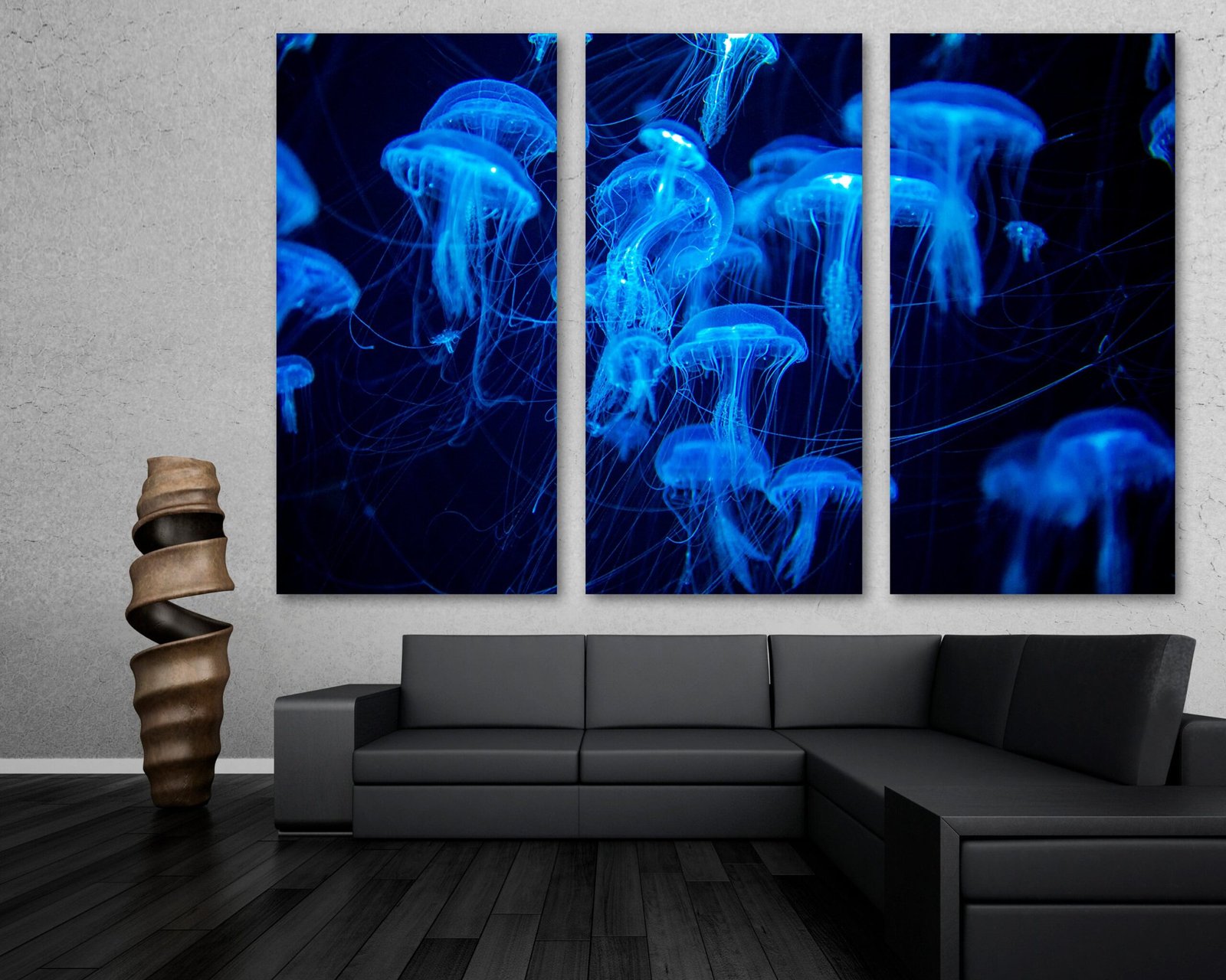 Blue Jellyfish Wall Art Canvas Print. Swarm Group Marine Life, Animal – Giclee Art For Home Decor, Wall Interior Design