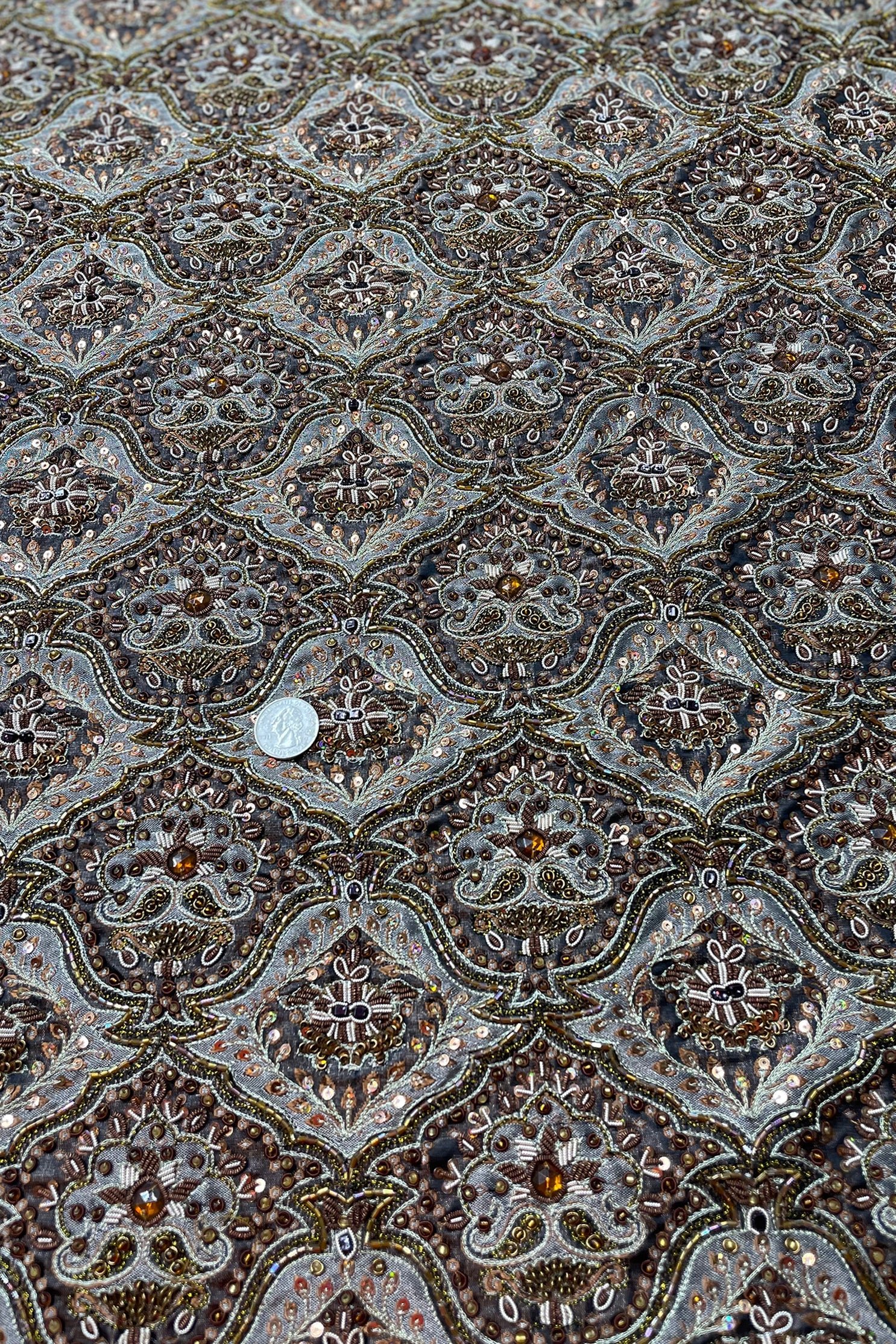 Introducing our exquisite Beaded Brocade fabric, the epitome of elegance and luxury. This very high-end Bronze Gold on Chocolate is a masterpiece of craftsmanship, adorned with intricate hand-beaded embroidery, featuring a mesmerizing interplay of beads, metallic coils, and sequins. Perfect for the most special occasions, Bronze Gold on Chocolate adds a touch of opulence to bridal and evening wear dresses, ensuring you stand out with unmatched sophistication. Its versatility extends to the world of entertainment, making it an ideal choice for Broadway costumes that demand a dazzling presence on stage. But that’s not all! Elevate your home decor with this Bronze Gold on Chocolate by using it for upholstery, creating stunning pillow covers that redefine elegance. It also lends itself beautifully to crafting jackets, clutches, and purses, transforming everyday accessories into timeless pieces of art. Our unique and distinctive fabric is available in a wide selection of colors. The fabric is sold by the Yard or 0.5 Yards and measures 44″ inches in width.