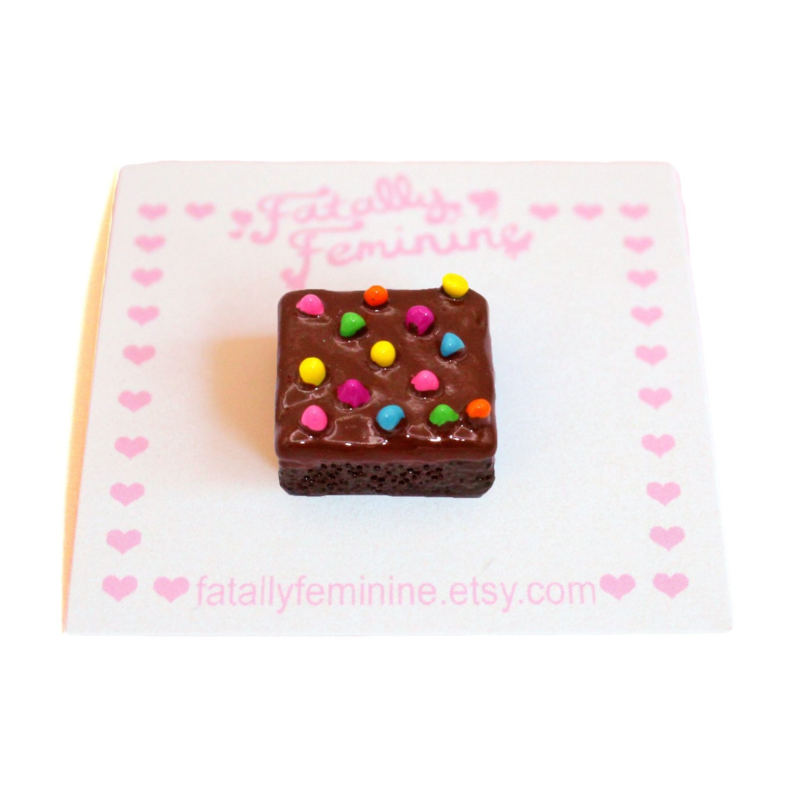 This tiny brownie was inspired by my favorite dessert. I can never seem to get enough of these chocolatey treats, & this charm is the perfect way to indulge! This brownie charm was handmade by me with great attention to detail & is extremely realistic. Thick, chocolatey, moist cake with the signature frosting & rainbow candy pieces. Glazed for shine & protection. Charm is about 3/4″ long & comes attached to a pin with butterfly clutch backing to attach to your bag, backpack, jacket whatever you want! Each charm is made to order just for you. Matching necklace & earrings & keychain in my shop>> http://fatallyfeminine.etsy.com Made to Order will take about 1-2 weeks to make before shipment. Every order comes with free gift packaging! Please contact me with any questions you may have & thanks for shopping FFD! Brownie Pin, Polymer Clay Brooch, Chocolate Lapel Rainbow Sprinkle Miniature Food Jewelry, Kawaii Jewelry