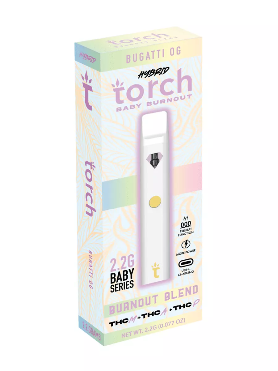 Here are the key features of the Bugatti OG Torch Baby Burnout Blend Disposable 2.2G: Potent Blend: Experience the power of THCM, THCA, and THC-P combined with strain-specific terpenes for a potent and enjoyable effect. Pre-Heat Function: Enjoy a hassle-free vaping experience with the pre-heat function, preventing clogs or leaks and ensuring smooth vapor production. USB-C Charging Port: The disposable features a convenient USB-C charging port (cable not included) for easy recharging, allowing you to enjoy the device for longer periods. Exceptional Flavor: Indulge in the distinct flavor of Bugatti OG, offering a unique and enjoyable taste experience. Strain Types: Torch offers their Baby Burnout Blend Disposables in a range of strain types, including Hybrid, Indica, and Sativa, catering to individual preferences. Farm Bill Compliant: Rest assured that the Bugatti OG Torch Baby Burnout Blend Disposable 2.2G complies with section 10113 of the 2018 Farm Bill, ensuring the delta-9 THC content is below 0.3%. Experience the exceptional flavor and potent effects of the Bugatti OG Torch Baby Burnout Blend Disposable 2.2G. Order now from Olofly and elevate your vaping experience with Torch’s commitment to quality and outstanding blends. Enjoy the long-lasting effects and savor the unique flavor of Bugatti OG.