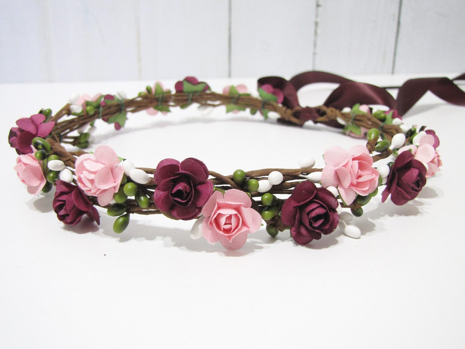 Burgundy Floral Crown, Two Flower Color Headband, Blush Red Wedding Bridesmaid Girls Headband