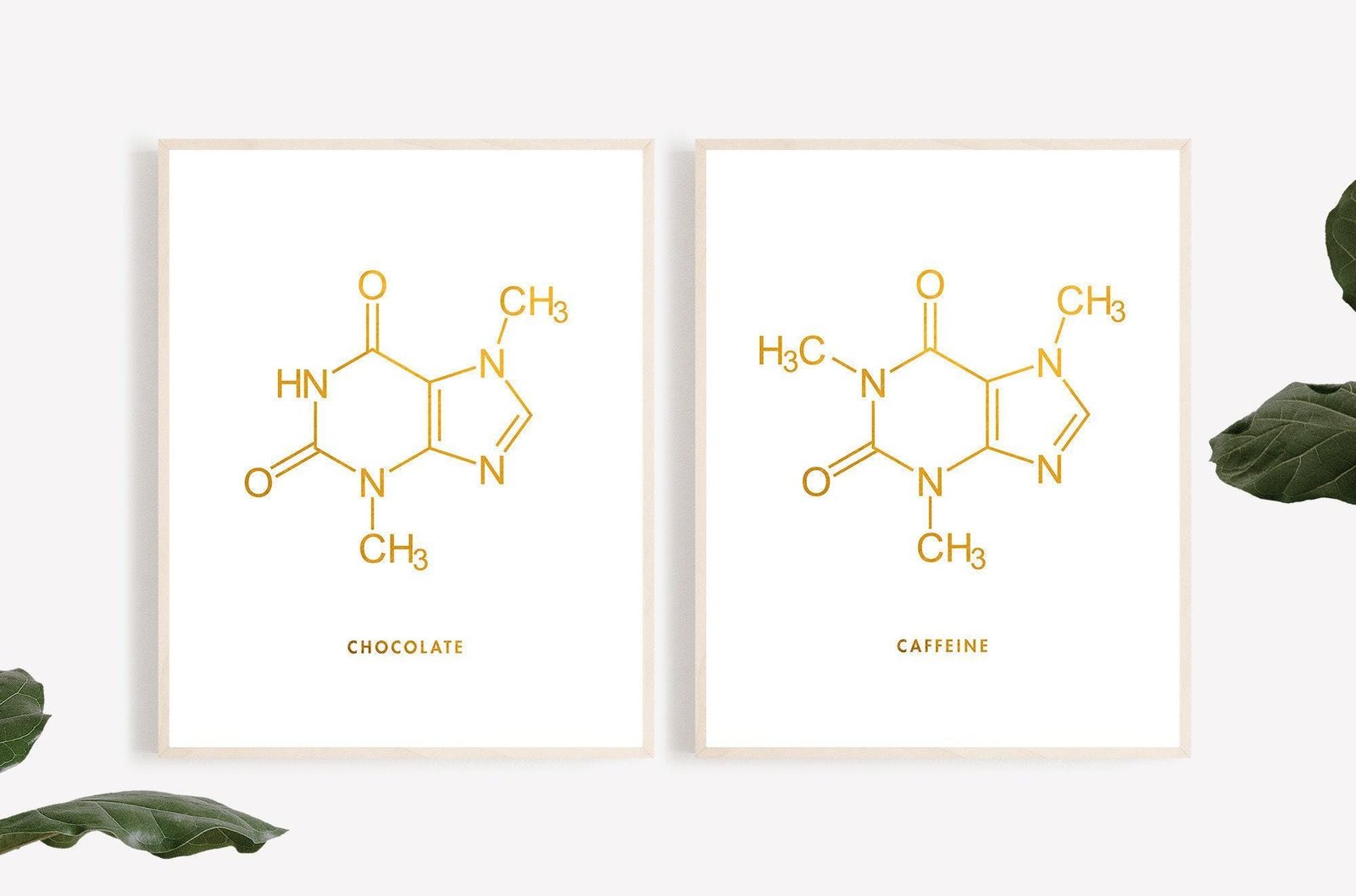 Chocolate & Caffeine Molecule Foil Print Set Of 2 – Coffee Science Lab Decor Chemistry Teacher