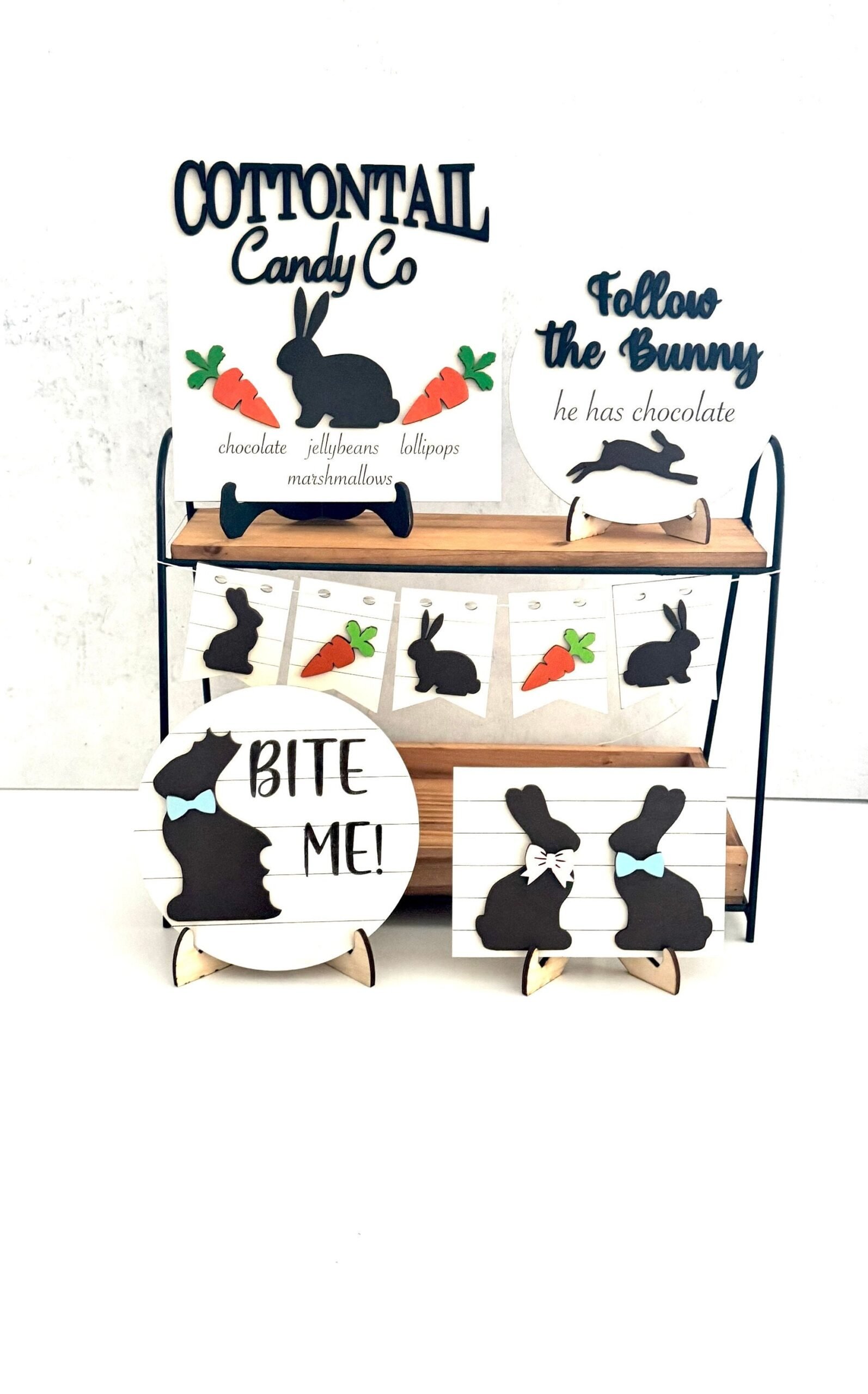 Easter Tiered Tray, Easter, Easter Bunny, Chocolate, Easter Candy, Easter Signs, Easter Decor, Rabbit Signs, Rabbit Decor, Bunny Decor Transform your home into a Springtime wonderland with our delightful Easter Bunny Chocolate Tiered Tray. Crafted with meticulous detail, each bunny showcases rich chocolate hues that perfectly capture the essence of the season. Imagine the charm of whimsical bunnies adorning your mantle or dining table, their enchanting presence inviting both warmth & festivity. These decorative pieces play the perfect host at any Easter gathering, exuding joy & a sense of whimsy that children & adults alike will adore. A nod to the playful spirit of Spring, these decorative chocolate bunnies pair tradition with modern elegance. Whether displayed on their own or as part of a grand Easter centerpiece, they are sure to leave a sweet impression. DETAILS: – Created using Birch Wood. – Each piece is handpainted/stained by me. – Backs are not painted. If you need measurements, please message me. ORDERING: Using the dropdown menu, please select your choice: – Full Set – Cottontail Candy Sign – Follow The Bunny Sign – Banner (Does NOT come with string) – Bite Me Sign – Two Bunnies Sign -Does NOT include Tiered Tray itself, faux carrots, or greenery. SHIPPING: Shipping will be sent via USPS with an estimated 2-6 business day delivery, depending on what State you reside in. (West Coast may take a few days longer) RETURN INFO: I do not accept returns but if your order arrives damaged, please send me a picture or two of the damage & the box within 24 hours of receiving your order. A replacement or refund (we will discuss) will be sent after we receive the pictures of the item showing that it has been destroyed & cannot be used. LETS STAY CONNECTED!! Add Noah’s Arc Creations to your Etsy FAVORITES so you can see all of my latest creations! Im also on FACEBOOK!! Thank you! Johanna Chocolate Easter Bunny Tiered Tray, Handmade Decor, Table Centerpiece, Display, Party Rabbit Signs