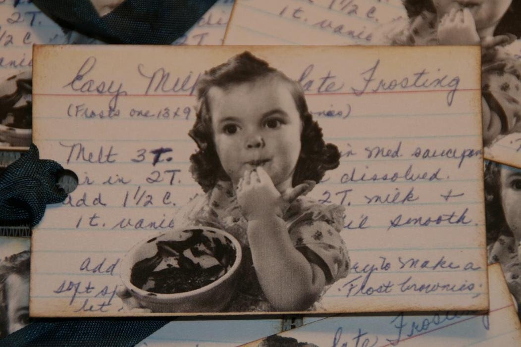 This is for 6 darling gift tags made from a vintage image of a old handwritten Chocolate Frosting recipe with a black & white vintage image of a little girl licking the bowl. I have also added deep water blue soft ribbon ties to match the blue ink used on the handwritten index card. They are so cute! Each one is 4″ x 2 1/2″ in size. You can also order these without the holes punched! They would be perfect for a little girls birthday party invitation, favor bag, attached to your homemade goodies, cardmaking, etc. Chocolate Frosting Recipe Altered Art Gift Tags Christmas