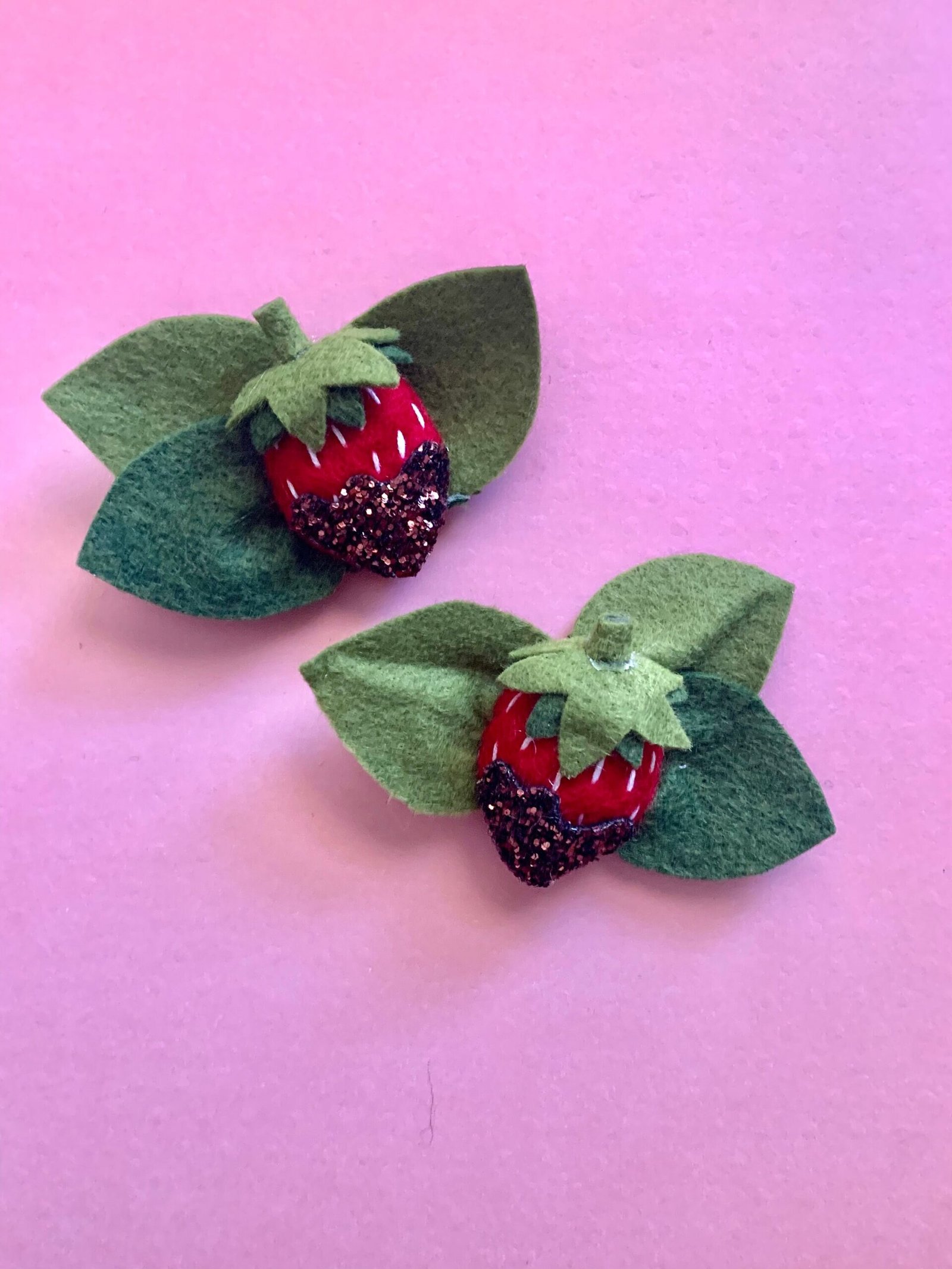 Handmade felt strawberries with sparkle chocolate felt! Perfect for pigtails or single clip. Select quantities below Chocolate Strawberry Hair Clip(S Valentine Accessories