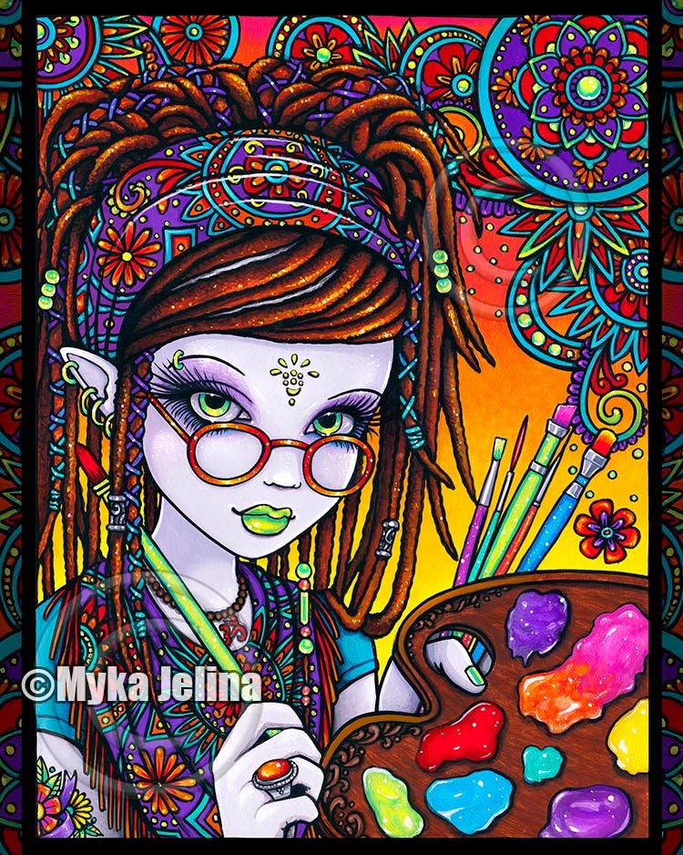 “Dreamer” Psychedelic Trippy Hippie Mandala Rainbow Dreadlock Bohemian Girl Painter Artist Fairy Signed Art Print by Myka Jelina Art Directly From The Official Myka Jelina Art Etsy shop. Printed, sold, hand signed & shipped by me Myka Jelina the original artist of this piece. The artwork is painstakingly scanned & hi-resolution prints color-matched to the colors of the original acrylic painting it represents by me personally. This artwork can only be seen in it’s truest form & detail as well as color clarity purchased directly through my studio. Trust me when I say they are just beautiful in person. These small devises & computer screens just do not do them justice. Open Edition, Choose size from drop down menu. Available in 8×10 inch (signed on front) 11×14, 12×16, 13×19 inch (signed & dated on back). Print Medium: Printed by the artist Myka Jelina on heavy weight photo paper with Claria inks. This is a professional grade paper featuring acid free glossy photo quality stock for long life & lasting color. Packaging & Shipping: 8×10 inch shipped in rigid flat mailer, larger prints shipped rolled in tube. USPS with tracking information to your destination. Authenticity: This is an official product that bears the artists autograph on the front lower left hand margin, in the white unprinted area. Custom signing available on request. Example: Happy Birthday from Myka Jelina. Important Note: Monitors, tablets & smartphones vary in the reproduction on colors. This artwork is painstakingly scanned & color-matched to the colors of the original acrylic painting it represents by me Myka Jelina. You will not believe the colors when you see them in person! About the artist: Myka Jelina is a fantasy artist living in the beautiful Missouri Ozarks. Her paintings are easily recognized by their eclectic fairies, glossy eyed beauties poised in intricate scenes of Gothic, modern & classical adornment. Myka’s artwork draws from the delicate relationships between light, darkness, beauty & balance. Myka is a painter in the traditional sense, whose favorite painting mediums are acrylic paints & wooden panels. Myka had been selling her paintings online for a couple years when in 2005 the clever, bright eyed faeries began fluttering into places like Hot Topic, Target, Spencer Gifts, Hastings & mom & pop shops worldwide. in recent years her fairy artwork can be found on a myriad of products including collectable figurines, canvas reproductions & many, many others. Copyright Information: Copyright © by Myka Jelina Dreamer Myka Jelina Signed Print Psychedelic Trippy Hippie Mandala Rainbow Dreadlock Bohemian Girl Painter Artist Fairy