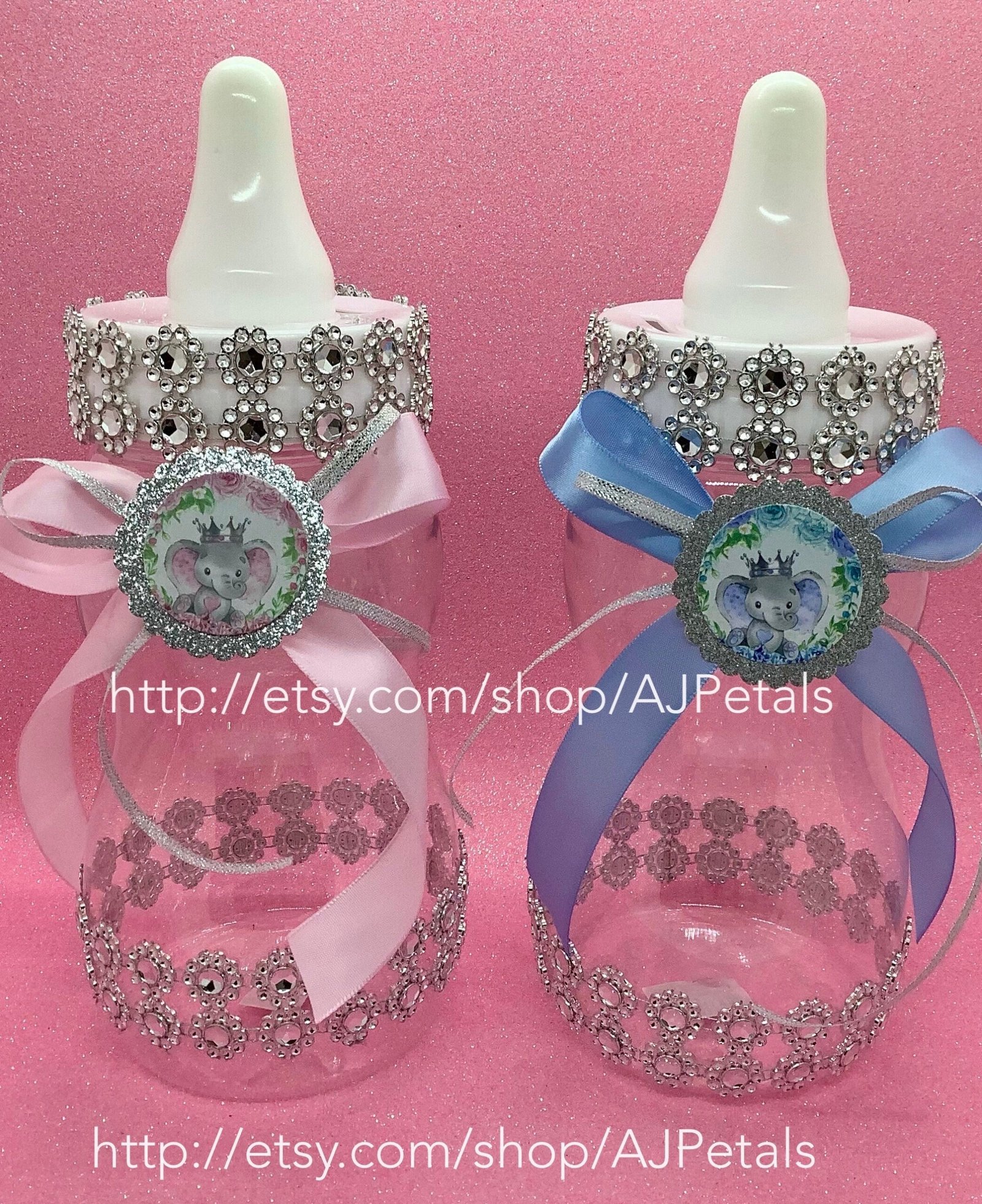 This is for 4 Elephant Centerpiece Baby Shower Fillable Bottle Piggy Bank. This is the Perfect Elephant Centerpiece for your baby shower. Make This Your Special Gift for your guest to keep has a souvenir the bottle fits chocolates, marshmallows , candies, gummy bears, mints, coins, you name it. This piggy bank is fillable & has a little coin hole in the cap of the bottle to put coins inside. Large Size: 11′ inches tall x 4″inches Wide Each One Of Them Is Handcraft & Made of Durable Plastic. Available in – Pink/Silver Light Blue/Silver The bottles include ribbon, Baby Elephant & rhinestones around. Please make sure to provide the correct shipping address when placing your order,orders will be shipped out to the address provided. Transit time varies & depend on the carrier,we cannot be held responsible for delays cause by carriers. Any questions please contact me. Thank you for visiting my shop.:) Elephant Baby Shower Centerpieces Fillable Piggy Bank Bottles | Set Of 4