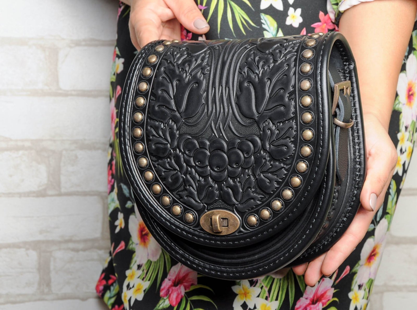 Embossed Black Leather Crossbody Bag Handmade Guelder Rose Purse