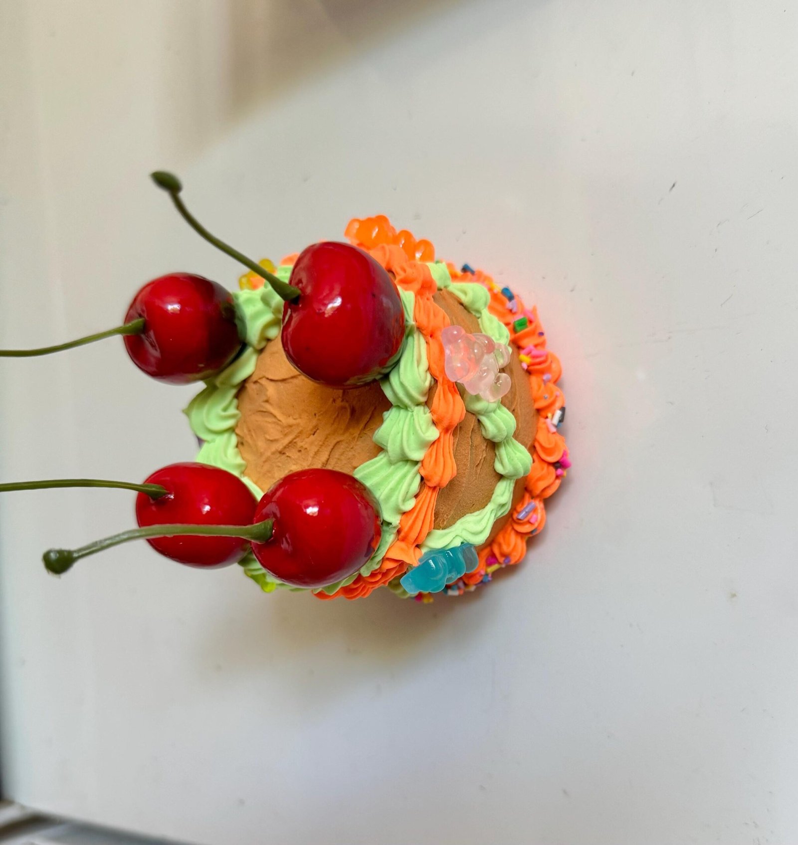 Handmade fake cake fridge magnet 8cm wide x 7cm height Message for custom designs & decorations Fake Cake Cupcake Magnet ~ Choc With Gummy Bears Cherries