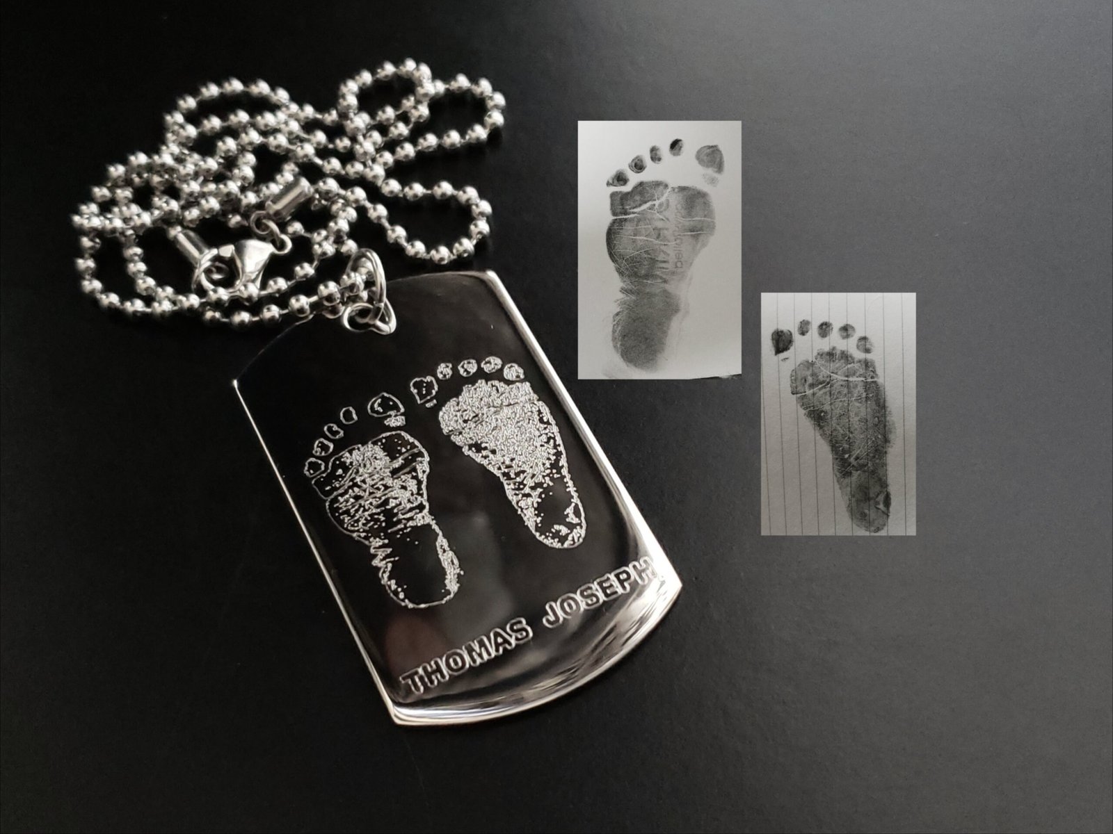 Your loved onesprints handcrafted by me in solid stainless steel. Digitally formatted & machine processed. This process is very unique, time intensive & developed by me in my studio. This will be an exact replica of your print. Prints are immortalized into the metal that will never come off or fade away. Photos of people are lightly etched using topical engraving. Care needs to be used if using photos. The prints are engraved into the metal. You can actually feel the impression. The engraving is the same color as the metal color. If you are wanting a darker oxidized engraving, please see my store Design with a fingerprint, handwriting, baby’s heartbeat, paw print, nose print, logo, hand print footprint or in your own words using my font charts. Many many ways to customize! ❀ WHAT’S INCLUDED: ❀ – One stainless steel keychain or necklace with your original prints. – Dogtag size – 29mm x 50mm dog-tag shape (2″ long) – One 30mm stainless steel flat split ring OR choose 18″ to 24″ stainless steel chains or leather (see pic #8 for style) 18″ has screw off ends, the 20″ does not. – Double sided engraving (choose from drop-down menu) – Gift box & ribbon ❀ BACKSIDE ENGRAVING: ❀ (optional) If using your own words & my font chart, please double check your spelling, punctuation & dates. Items will be engraved exactly how you type them to me. Font chart see pic #9 ❀HOW MANY WORDS: ❀ I can basically scale anything fit by resizing the text. Please keep in mind the more text the smaller the lettering. I recommend drawing out the size you want & write in the words. This will give you an idea placement & size. ❀ IMAGE-PRINT SIZE ❀ If your fingerprint, paw print, nose print, image ect. needs to be a certain size, you MUST include the millimeter/measurements of the actual print with you personalization. If you are expecting it to be a baby’s fingerprint but do not specify measurements, it will be engraved at the resolution in which I received it in. ❀ PROOFS: ❀ If you have a certain way you’d like your special piece, please draw up a simple sketch & include it with your images. If there are any issues, I’ll send you back a recommendation proof. ❀ HOW TO ORDER & SEND ME YOUR PERSONLIZATION: ❀ ((super easy After checkout, send your images to me in a message here on Etsy. Full details on “how to” in pic#10 Please include engraving/wording in the “NOTE TO SELLER BOX” during checkout. Please type words as you would like them to be engraved. Include font preference from font charts (see pic#9) TURNAROUND TIME & SHIPPING: Due to popularity of this item, your jewelry items will be shipped within approx 3-5 days of when I receive your print & it will arrive in a very attractive gift box & ready for gift giving. This is truly a custom work of art & well worth the wait! If you’d like your order by a specific date, send me a message & I’ll see if I can accommodate you. Holiday turnaround times may vary QUALITY: All of my items are handmade & only top