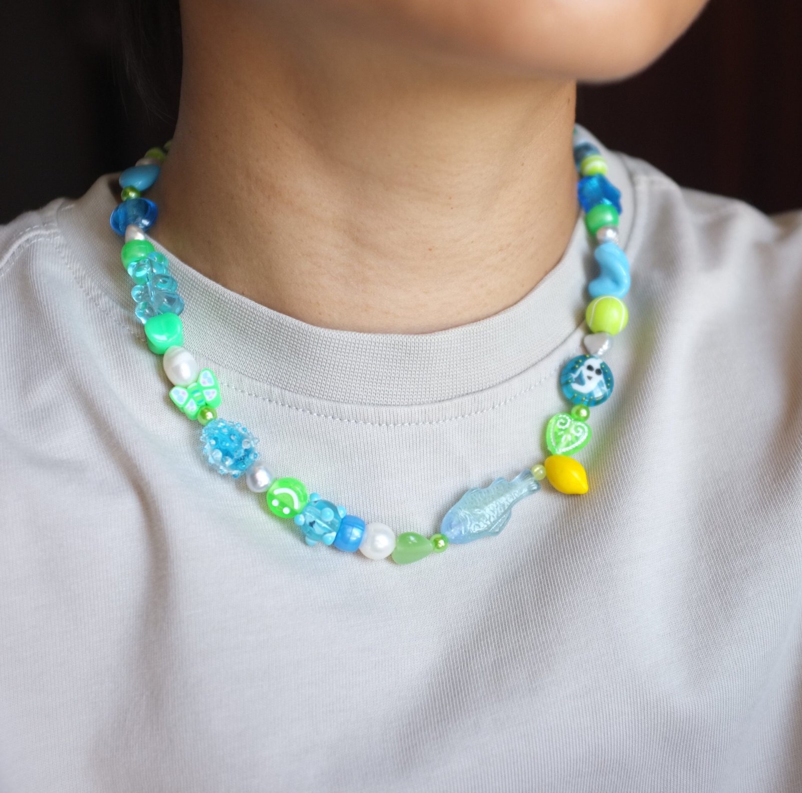 Fresh Water Pearls With Sour Lime Neon Green Glass Fish Ghost Beads Unisex Necklace, Hand Made Men Lemon Gummy Bear, Blue Berry Funky Panda