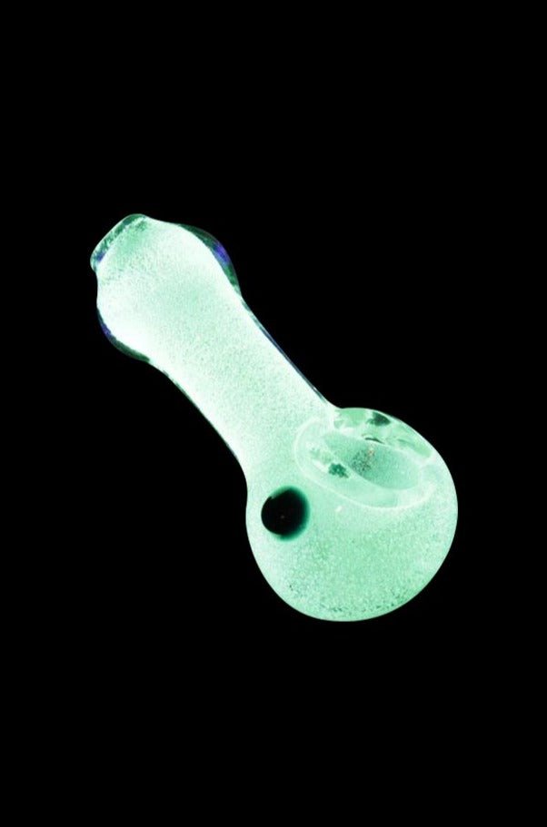 Wow your friends at the next nighttime smoking session with the cool Glow Spoon Hand Pipe. Made of thick, heavy-duty borosilicate glass, this 3-inch long spoon-style pipe is super sturdy and fits comfortably in the palm of your hand. This great little pipe glows in the dark when used under a UV blacklight! It features a nice deep bowl that holds plenty of herbal goodness and has a color accent marble on the side to provide a good grip. The raised marble also serves as a roll stop so the pipe doesn’t roll away when you set it down between hits or when packing the bowl. With its fumed stripe design, and glow in the dark capability, you’ll get lots of use from this durable little pipe that lights up the night!
