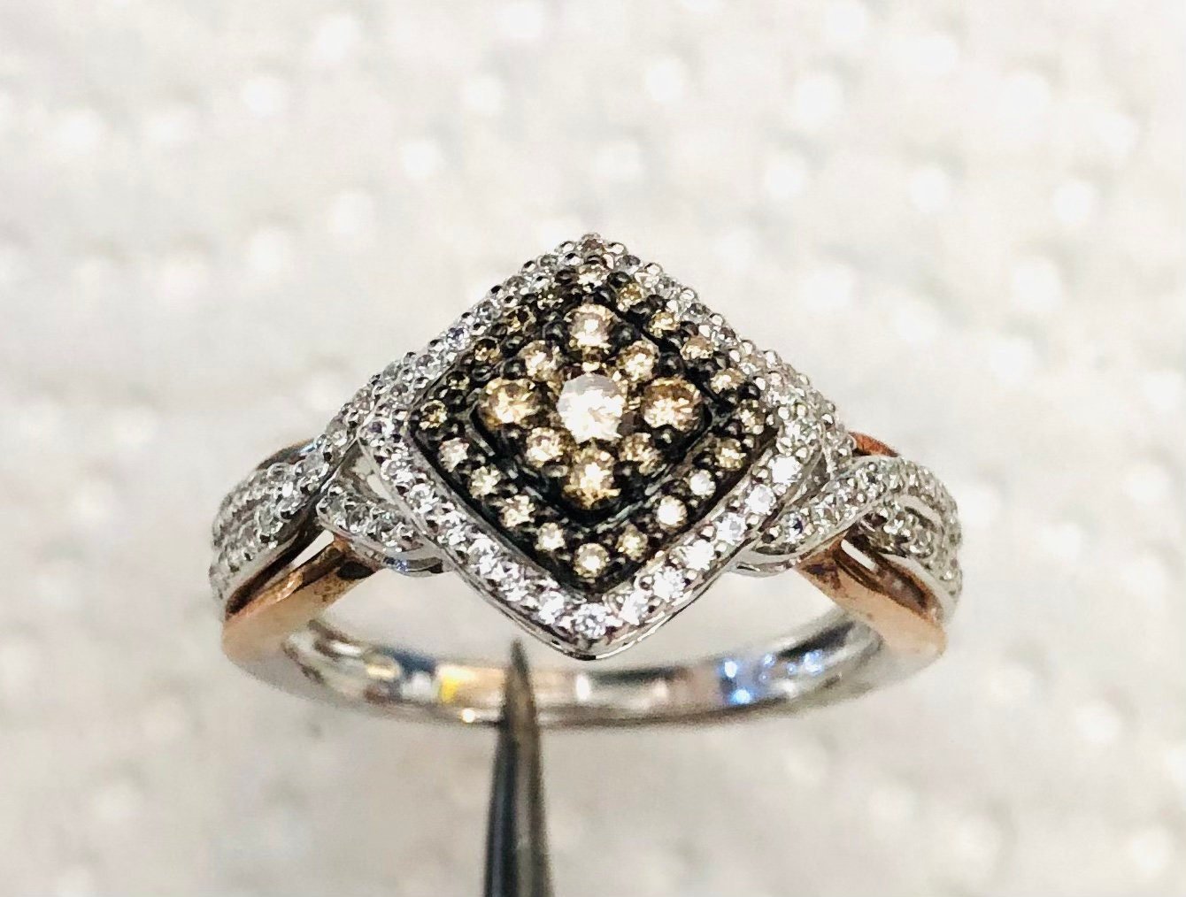 Gorgeous Two Tone Genuine Chocolate Diamond & Cubic Zirconia Ring, Set in 925 Sterling Silver Plated with 18k Rose Gold. This rings is absolutely stunning. Features genuine chocolate diamonds in a beautiful cluster, surrounded by glistening cubic zirconias in a halo. 9 Chocolate Diamonds .26 Carat Tw Solid 925 sterling silver. plated with 18k rose gold. We have many more in this collection. All Featuring genuine champagne diamonds with white cubic zirconias. Available for Christmas deilvery. Order yours today. USA Owned & Operated Ships from NY ID66 Gorgeous Two Tone Genuine 29 – Chocolate Diamond .26 Ct Tw Cz Ring 925 Sterling Silver. Brown Diamonds Are, White Stones Are Cz