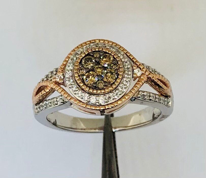 Gorgeous Two Tone Genuine Chocolate Diamond & Cubic Zirconia Ring, Set in 925 Sterling Silver Plated with 18k Rose Gold. This rings is absolutely stunning. Features genuine chocolate diamonds in a beautiful cluster, surrounded by glistening cubic zirconias in a halo. 9 Chocolate Diamonds .20 Carat Tw Natural Others sell Brown CZ Solid 925 sterling silver. plated with 18k rose gold. We have many more in this collection. All Featuring genuine champagne diamonds with white cubic zirconia. Available for Christmas deilvery. Order yours today. USA Owned & Operated Ships from NY ID67 Gorgeous Two Tone Genuine 9 – Chocolate Diamond .20 Ct Tw Cz Ring 925 Sterling Silver. Brown Diamonds Are White Stones Are Cz