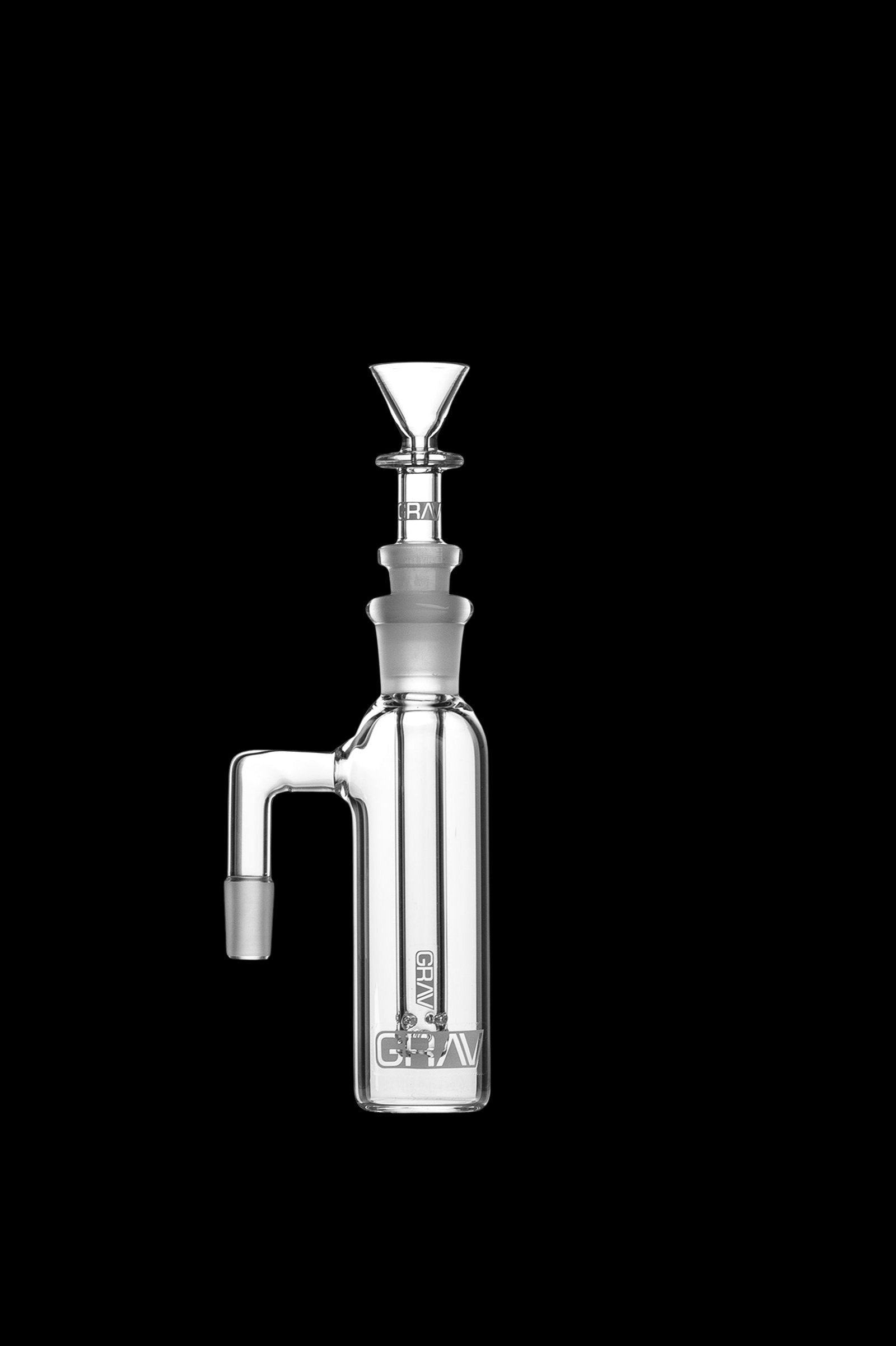The GRAV® Ash Catcher is 5″” tall and made on 38mm tubing. Its fission downstem diffuses smoke through water and can be removed for easy cleaning. Its 90° angled arm is designed for use with a 14.5mm female joint on any straight-based water pipe. The ash catcher comes ready to use with a 14.5mm funnel bowl and works best with approximately 1.5″” of water.
