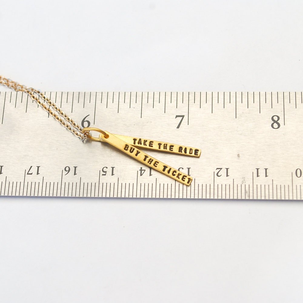 Note about chains: All 18″ chains have capability to be 16″ chains. If you order a 16″ or an 18″ chain you are getting the same item because this particular chain offers 2 different rings for the clasp to make it adjustable. Note about shipping: Most items ship within 1-2 days. Gold can take up to 5 days. Personalized items take 3-7 days. Wanderlust quote necklace “Buy the ticket, take the ride.” Quote by Hunter S. Thompson. These inspiring words are a perfect present for anyone celebrating the power of travel, adventure, & life! This pendant is hand stamped in metal clay, pmc & then molded & cast in sterling silver. Chocolate & Steel is the artist & the crafter. The pieces you purchase from me are made by me & my small team of artisans. You are purchasing directly from the artist. This necklace features 2 bars with the quote on it. Each pendant measures roughly 1/8″ x 1″. 14kt gold pendant is hung on a 14kt gold fill chain. Sterling silver pendant is hung on a sterling silver chain. ✴ SPECIAL DESIGNS ✴ If you like this you should also take a peek at our unique take on the quote necklaces. Whether you like the subtle traditional look of the long bar necklace or are looking for something extra ✴ special✴ we’ve got you! https://www.etsy.com/shop/ChocolateAndSteel?ref=l2-shopheader-name&search_query=variation GIFTS We are SO happy to send gifts directly to the recipient. Choose “Gift” & tell us what you would like the card to say. Be sure to tell us who to sign it from. All jewelry is shipped in packaging worthy of gift giving. Your necklace will be hung on a card with the quote on it & in a jewelry box (see example). ♻ Environmental Impact & Sustainability ♻ These words of inspiration are GOOD for you & GOOD for the planet. See my profile to learn more about the materials I use (reclaimed silver) & the process (’tis magical) Hunter S Thompson Wanderlust Quote – Buy The Ticket, Take Ride Sterling Silver & 14Kt Gold Vermeil Necklace By Chocolate Steel