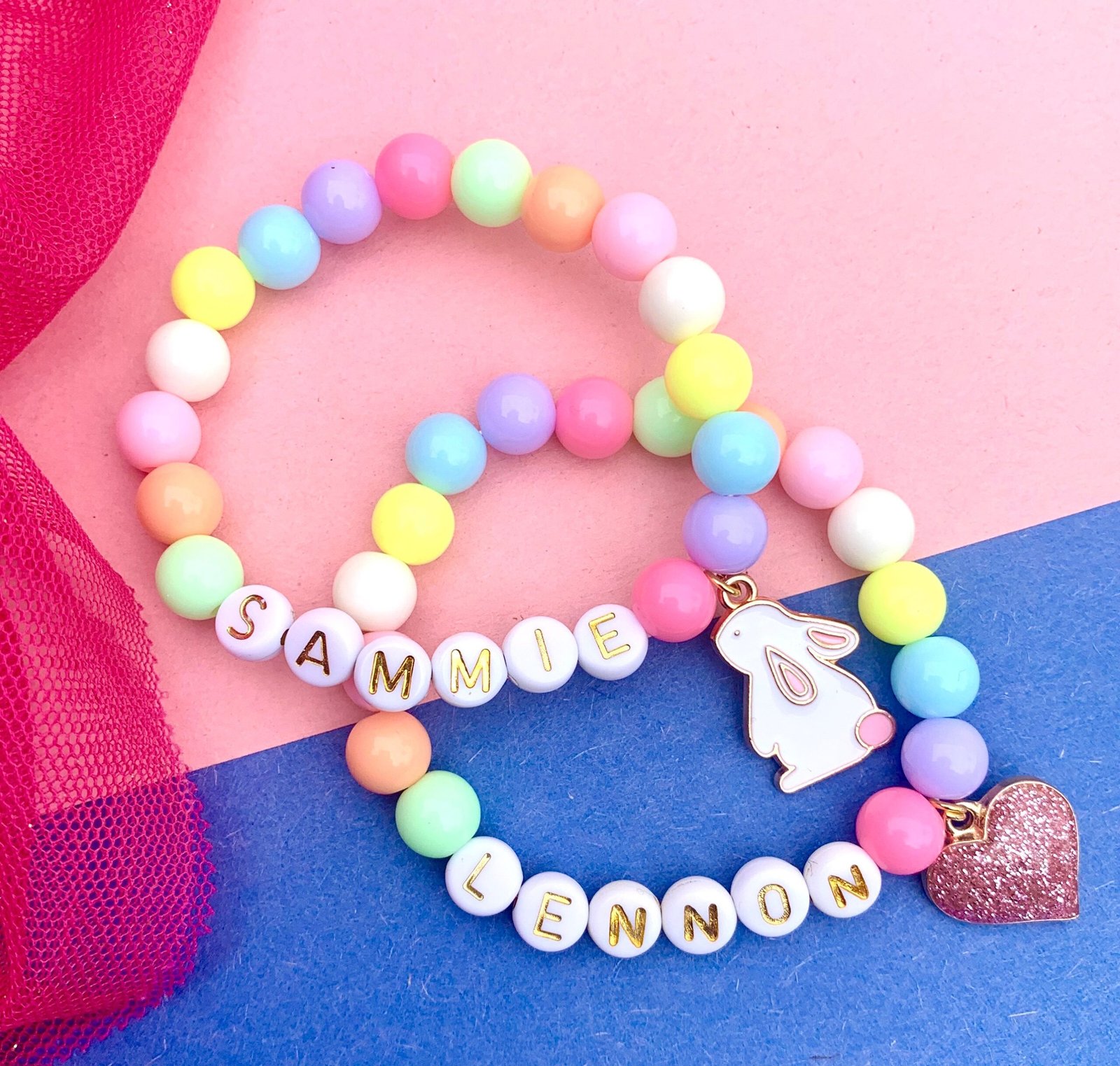 These fun bracelets are stylish & chic for young girls. Perfect Christmas stocking stuffers, easter basket gift, gift to fill Easter eggs for egg hunt, birthday gifts, friendship bracelets, the list can go on. Bracelet listing includes ONE custom name bracelet ( can also have it say a word or phrase such as best friends, besties, etc) with the option of a bunny, princess, unicorn gummy bear or heart charm. Pair with our solid stacking bracelets to make a cute custom stack! PRODUCT DETAILS: – All letters are upper case – Use “personalization” box at checkout to list your name/phrase for bracelets – Bracelets are made with stretchy quality jewelry elastic – All orders are FINAL SALE as they are custom orders. Please double check spelling & size. Kids Easter Gift For Kids Easter Outfit Basket Stuffer Toddler Gifts Jewelry Name Bracelet Birthday Girl