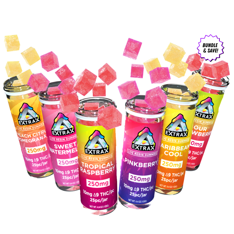Live Resin Delta-9 THC Gummy Bundle | 3 Pack Suggested Use: Consume 1 gummy to start to establish individual tolerance. Increase dose in increments to achieve desired effects. Flavor Profile Caribbean Cool: Sweet orange citrus, pineapple, and tropical fruit. Sour Strawberry: Sweet and sour strawberry Peach Citrus Pomegranate: Fresh peach, sweet citrus, and tart pomegranate. Sweet Watermelon: Sweet and juicy watermelon. Tropical Raspberry: Raspberry with a tropical fruit melody. Additional Product Information 25 gummies per jar 10mg of Delta-9 THC per gummy 250mg of Delta-9 THC per jar 3 jars per bundle 750mg of THC blend per bundle Soft, chewy texture dusted in sugar