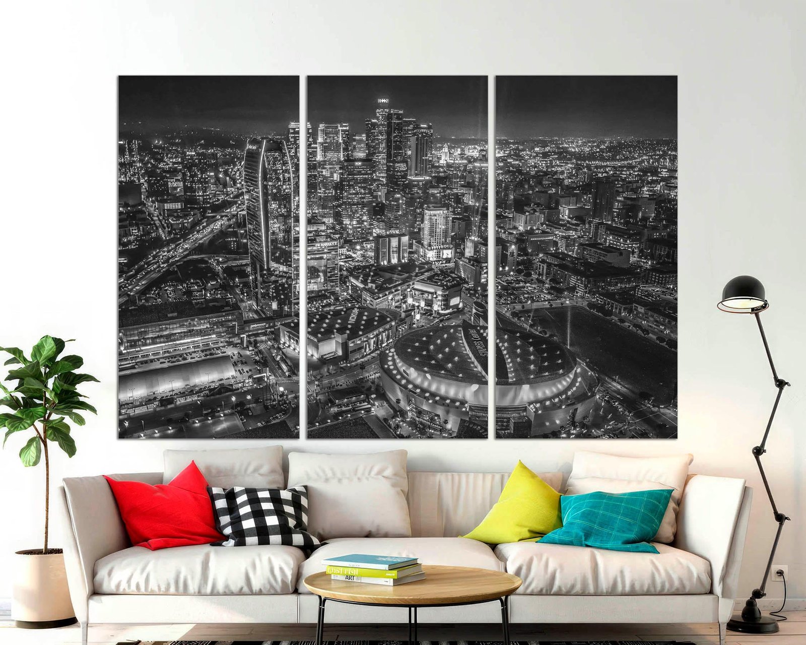 Los Angeles Staples Center Canvas Wall Art 3-Panel La Downtown Night Skyline Print Large Sports Decor, Perfect Office Ready To Hang
