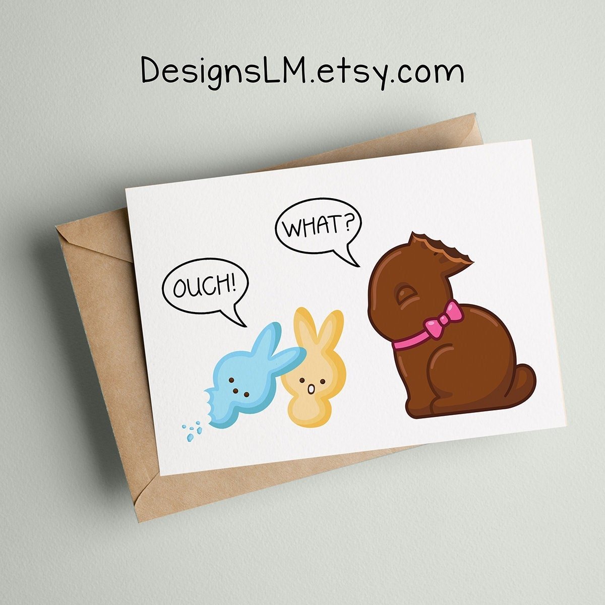 Marshmallow & Chocolate Bunnies – Ouch! What? Wishing you a Very Happy Easter! – Greeting Card with your choice of inside text – CARD SIZE: 5 x 7 inches (A7 size) – DETAILS: Professionally printed on 100# Cover Includes 1 envelope Cards are packaged in a plastic sleeve & shipped in a rigid mailer – CUSTOMIZATION: All cards are made to order. Please include any special instructions or custom text in the personalization box or the “Add a note to DesignsLM” box at checkout when ordering. – SHIPPING DETAILS – USA: Standard shipping – once shipped please allow 3-14 days for delivery Priority Mail – once shipped please allow 2-5 days for delivery (Shipping times are estimated. Most orders are being delivered fairly quickly, but some areas are still experiencing significant delays with the post office.) Delivery times are estimated & not guaranteed. For holiday cards & card orders with a specific need by date, PLEASE order early. Delays with the USPS have been very common lately. Orders may arrive after the estimated delivery date provided by Etsy. – SHIPPING DETAILS – INTERNATIONAL: Please allow 1-4 weeks for delivery. Shipping times vary & are not guaranteed. International customers are responsible for all custom fees, taxes, import fees, etc. issued by your country/postal service – WANT YOUR CARD SHIPPED DIRECTLY TO YOUR RECIPIENT: No problem! Please include your recipient’s address on the ship to section of the checkout screen. Please ALSO leave a note in the “Notes to DesignsLM” box that you want your card directly shipped & include any special messages, to/from names you’d like printed inside. & we’ll gladly send your card directly in the envelope with no packing material. – OTHER CARDS AVAILABLE HERE: BIRTHDAY www.etsy.com/shop/DesignsLM?section_id=16266652 LOVE/NAUGHTY CARDS www.etsy.com/shop/DesignsLM?section_id=15873064 ALL OCCASION www.etsy.com/shop/DesignsLM?section_id=16611816 PREGNANCY ANNOUNCEMENTS www.etsy.com/shop/DesignsLM?section_id=17288516 – Thanks for vising! If you have any questions, convo me & I’ll be happy to get back to you as soon as possible! Please read our shop policies for more information. www.etsy.com/shop/DesignsLM/policy?ref=shopinfo_policies Marshmallow & Chocolate Bunnies – Wishing You A Very Happy Easter 5×7 Printed Greeting Card Funny Notecard