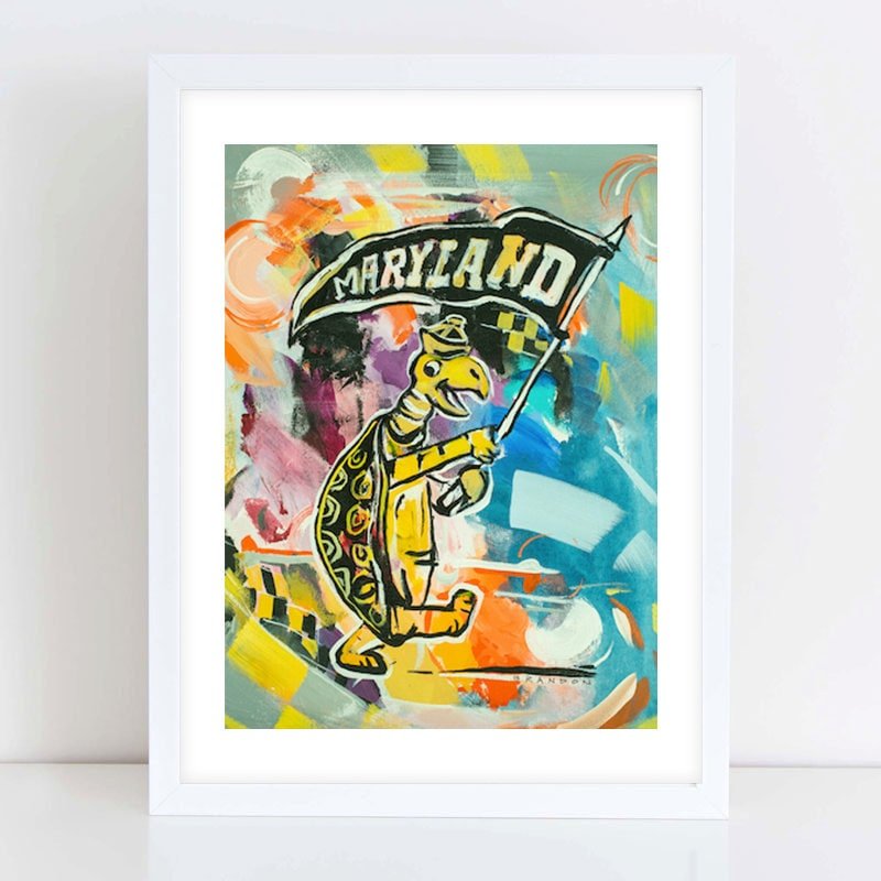 Introducing our Vintage Testudo the Terp Art Print – a nostalgic journey back to the heart & soul of the University of Maryland! Whether you’re a proud Terps fan, a devoted alum, or simply appreciate the vintage charm of this iconic mascot, this art print is the perfect addition to your collection. ???????? Terp Tradition: This art print beautifully captures the timeless allure of the vintage Testudo, representing a unique piece of the university’s history & embodying the enduring character that defines the Terps. ???? Nostalgic Aesthetic: With classic design elements & muted tones, it transports you to an era when Testudo stood as a symbol of strength & pride. ????️ High-Quality Craftsmanship: Meticulously crafted with premium materials, this art print is a lasting tribute to the rich legacy & the enduring charm of the University of Maryland. Celebrate the Terps spirit with our Vintage Testudo the Terp Art Print. Hang it proudly in your home, office, or gift it to a fellow Maryland enthusiast. Order yours today & relive the unique traditions & character of the University of Maryland! FINE ART PRINTS MADE in THE GREAT STATE OF GEORGIA LAYOUT: All prints include a modest white border which allows for protection of the printed image, wiggle room for framing & space for Brandon’s classic block “B R A N D O N” signature. QUALITY: We use acid-free, archival-quality papers for all of our prints & canvases. When properly stored & displayed, these prints will last for decades. We recommend keeping prints out of direct, intense sunlight & framing ASAP to protect print. PAPERS: 5×7: Premium 200g+ Matte Art Paper 8×10: Premium 200g+ Matte Art Paper 11×14: Acid-Free, Archival-Quality Watercolor Paper 16×20: Acid-Free, Archival-Quality Watercolor Paper 20×24: Hand-Cut Cotton Canvas Sheet 24×30: Hand-Cut Cotton Canvas Sheet 30+ Larger: Museum-Quality Papers MATTING: When shoppers purchase a “matted” option, they will receive their originally selected print adhered to a premium white framing mat & shipped in a protective sleeve. Prints are secured to the mats with acid-free framer’s tape. NOTE: A matted print will increase the total dimensions of the piece by one size. (Example: A Matted 5×7 will be a 5×7 print nestled into an 8×10 mat. A Matted 8×10 will be an 8×10 print nestled into an 11×14 mat. A Matted 11×14 will be an 11×14 print nestled into a 16×20 mat, etc) FRAMING: All framed pieces will arrive “ready to hang.” All frames have glass. Framing will add 1-2 inches onto all four sides of the ordered print size. All frames are made of natural wood and/or composite. We do not use plastic frames, & do not use acrylic glass. ALL SALES ARE FINAL. ALL IMAGES ARE COPYRIGHTED. DUPLICATION OF THIS PRODUCT IS PUNISHABLE BY LAW. . Maryland Terrapins “Vintage Testudo The Terp” By Brandon Thomas | Archival-Grade Giclee Fine Art Print