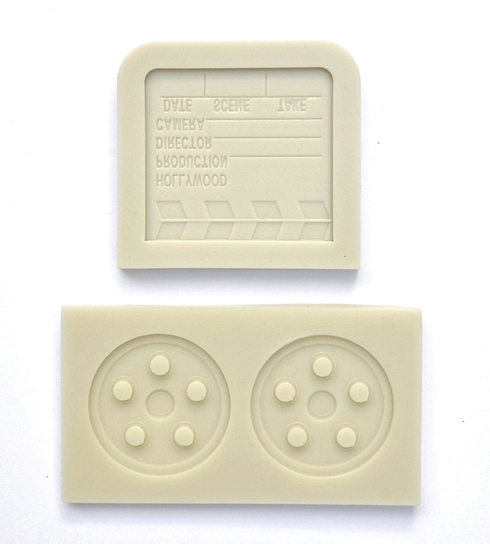 MOVIE THEME MOLD / Movie Reel & Clapper Silicone Fondant Mold / Hollywood Movie Cake Decorating / Chocolate Making / Resin Mold / Polymer Clay Mold Movie Reel cavity measures 1.5 inches in diameter. Movie Clapper cavity measures 1.75 x 2 inches. Fast turnaround & shipping Movie Theme Mold – Movie Reel & Clapper Silicone Fondant Mold, Hollywood Cake Decorating, Chocolate Making, Resin Polymer Clay
