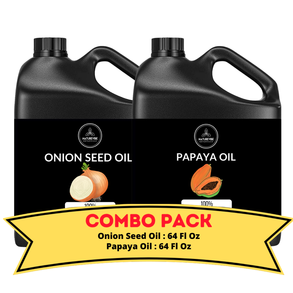 About: Onion Oil: The Naturevibe Botanical Onion oil is typically extracted through a cold-pressing method, ensuring that its natural composition of sulfur compounds, vitamins (especially C and E), and flavonoids remains intact. It can be used topically in aromatherapy, cold-pressed Naturevibe Botanical onion oil continues to be cherished for its versatile benefits, offering a natural and holistic approach to promoting overall health. Papaya Oil: Naturevibe Botanicals offers papaya seed oil, which is derived from the seeds of the papaya fruit (Carica papaya). Our oil is obtained from the cold press method, providing the oil in its natural method. Consisting primarily of Oleic and Linoleic acids, Papaya Seed Oil is a predominantly unsaturated oil that absorbs rapidly and feels wonderful on the skin. Naturevibe Botanicals Papaya Seed Oil is lightweight & non greasy used for skin, nails & hair. Also used as a moisturizer and body oil. Benefits: Onion Oil: Hair Growth: It stimulates hair follicles, nourishes hair roots, which can lead to stronger, thicker hair growth. It also helps in preventing hair breakage and split ends. Hair Conditioner: The emollient properties of onion oil help soften and condition hair strands, making hair smoother, shinier, and more manageable. Natural Cleansing: Onion oil can act as a natural cleanser for the scalp and skin, helping to remove dirt, excess oil, and impurities without stripping away natural oils. Papaya Oil: Moisturization: The oil is lightweight and absorbs quickly into the skin, providing deep hydration without clogging pores, making it suitable for all skin types including oily and acne-prone skin. Hair Conditioning: When applied to the hair and scalp, papaya seed oil nourishes hair follicles, strengthens hair strands, and adds shine. It can also help to prevent dandruff and promote healthier scalp conditions. Uses: Onion Oil: Mix onion oil with other soothing ingredients like aloe vera gel or honey to create a hydrating and rejuvenating face mask. Apply the mask evenly to clean the skin and leave it on for 15-20 minutes before rinsing off with water. Warm up onion oil slightly and massage it gently into your scalp using circular motions. Leave it on for at least an hour, or overnight if possible, before shampooing your hair as usual. This helps nourish the hair follicles. Combine onion oil with a natural hair mask base like yogurt or egg white. Apply this mixture to your hair and scalp, focusing on the roots and ends. Leave it on for 30-60 minutes before rinsing thoroughly with a mild shampoo. This can help strengthen hair and improve its overall texture Papaya Oil: Facial Serum: Incorporate papaya seed oil into your skincare routine by using it as a facial serum to improve skin texture, and boost overall radiance. Body Moisturizer: Apply papaya seed oil directly to damp skin after a shower or bath to lock in moisture and keep skin soft and smooth throughout the day. Scalp Treatment: Massage a few drops of papaya seed oil into the scalp to nourish hair follicles, strengthen hair roots, and improve scalp health. Leave it on for a few hours or overnight before washing it out. Massage Oil: Blend papaya seed oil with a carrier oil like coconut or jojoba oil by Naturevibe Botanicals to create a soothing massage oil.