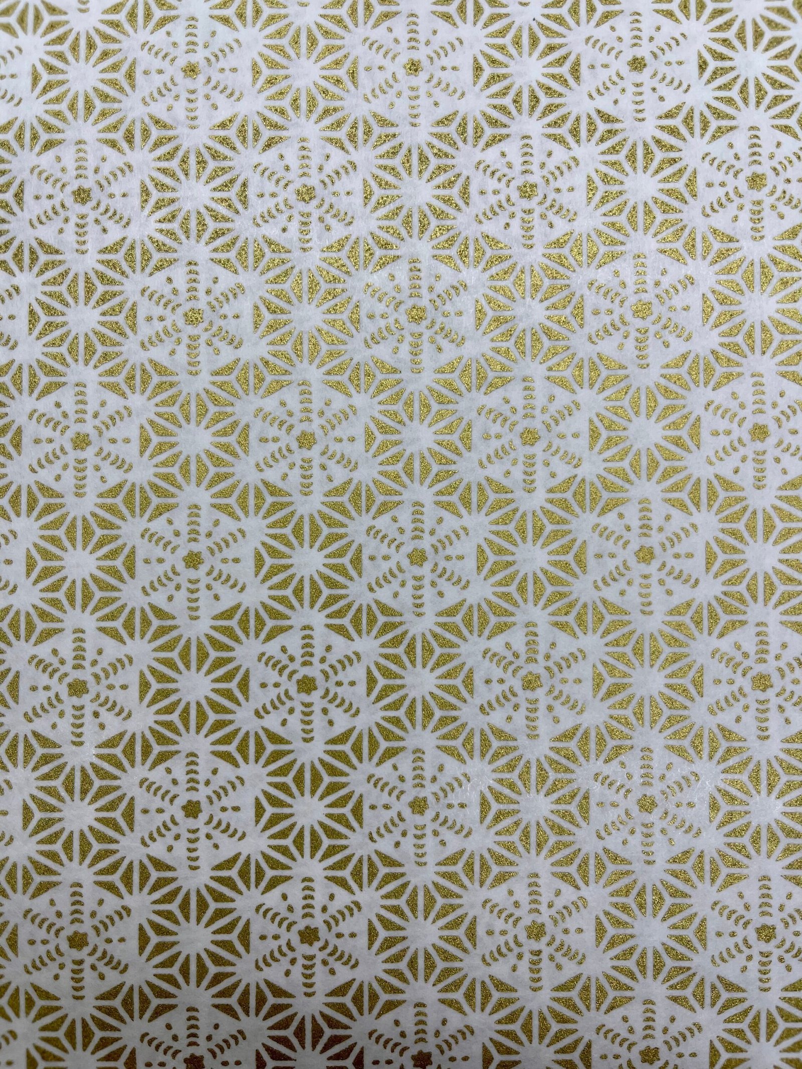 Japanese Yuzen washi paper are hand silkscreened onto Kozo base paper, providing durability & strength. This process requires multiple steps, as each color has to be individually applied & dried before the next color. This rigorous process distinguishes Japanese Yuzen papers from others! These papers are perfect for jewelry making, origami, & various paper crafts. This design features Blossoming Golden Asanoha on White Pattern. Sizes Offered: 6 x 6 inches (15.24 x 15.24 cm) 8.5 x 11 inches (21.6 x 27.9 cm) 18 x 12 inches (45.72 x 30.48 cm) 18 x 24 inches (45.72 x 60.96 cm) Please note the sheets are cut from a larger size so they will not be identical. Papers will be packed securely in an envelope & will not be folded. 18×12″ & larger sizes will be rolled in a shipping tube. If you would like a different size, please message me! While we try our best to represent the paper design & colors, colors may vary from screen to screen. Please let us know if you have any questions before purchasing. Origami -Yuzen Washi -Chiyogami -Silk Screen Paper -Craft -Various Sizes | M Blossoming Golden Asanoha On White Pattern #254