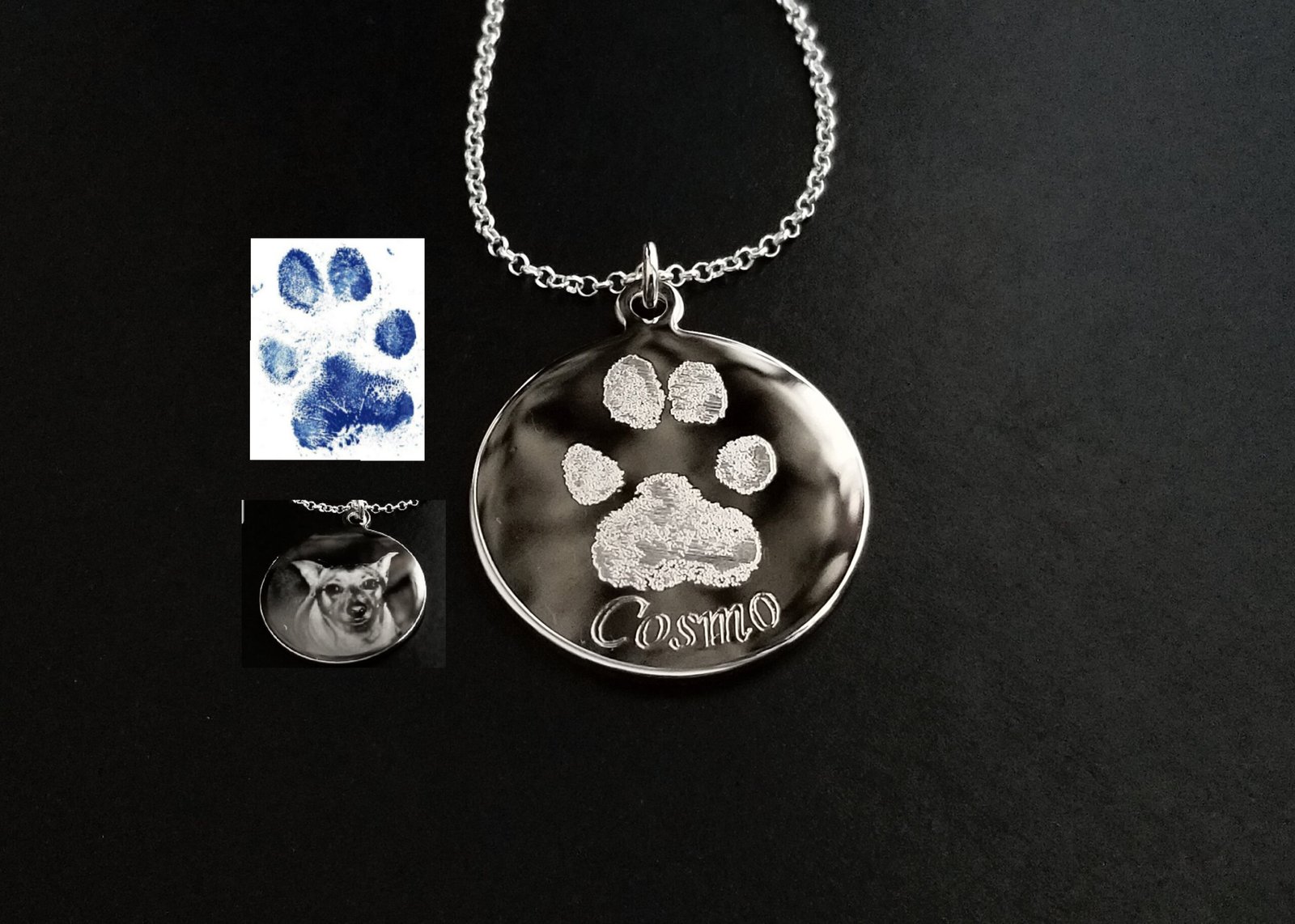 I am excited to offer such a unique & special keepsake & transforming your prints & art into a beautiful piece of jewelry just for you that will last a lifetime! Handcrafted by me in rhodium. I redesign it & then I run it through multiple programs before replicating it into the pendant. (no color is used) Digitally formatted & machine processed. This process is very unique, time intensive & developed by me in my studio. This will be an exact replica of the your photo, as I am able to shrink it to fit on the pendant. Your prints immortalized into the metal that will never come off or fade away. These items are topical engraved. (NOT DEEP) The “font or backs& ide” engraving is the same color as the metal color. WHAT’S INCLUDED: – One silver color rhodium plated pendant necklace with paw or photo (optional) on the front (head shots work best) – Choose single or double sided from the drop-down – If your special piece requires a font on the back, see small photo boxes for chart – Pendant size 23mm (slightly smaller than 1″ or 27mm round (1″ approx. round) – Comes with an 18″ .925 sterling silver 1.9mm cable chain -Gift box & ribbon – Choose chain/no chain from drop down PENDANTS ARE FLAT – some photos portray a more rounded look, this is due to the shine. Samples for the back: A loved ones handwriting (see sample photos) Verse, poem, signature, dates, ect…. Rhodium belongs to the platinum group metals. It is a silvery-white metal that is hard & durable that exhibits high reflectance. Rhodium plated pendants & are highly resistant to oxidation or tarnishing. ❀ FACE ENGRAVING: ❀ If using a photo of a loved-ones face or a fur-babies face, these photos are holographic Laser Etched into the metal. These will have more of a hologram look & look differently in certain lighting. HOW TO SEND ME YOUR PRINTS ((super easy During checkout, please use the “note to seller” box for any personalization other than your prints. This may be a name, dates, font (font chart, see photos) ect. You will send your prints to me in a message here on Etsy after you have made your purchase. HOW DO I TAKE/GET PRINTS? See detailed instructions in the photo section above TURNAROUND TIME & SHIPPING: Due to popularity of this item, your jewelry items will be shipped within approx 2-10 days of when I receive your print & it will arrive in a very attractive gift box & ready for gift giving. This is truly a custom work of art & well worth the wait! If you’d like your order by a specific date, send me a message & I’ll see if I can accommodate you. Holiday turnaround times may vary QUALITY: All of my items are handmade & only top quality materials are used. This is what I do full time, I take pride in my work & would never send out anything that I wouldn’t use myself. Most pendants are 20-18 gauge. Rhodium plated pendants are tarnish resistant. SIZING: Please note: My sample images are enlarged for detail & demonstration only & are not the actual size. For accuracy, please use a