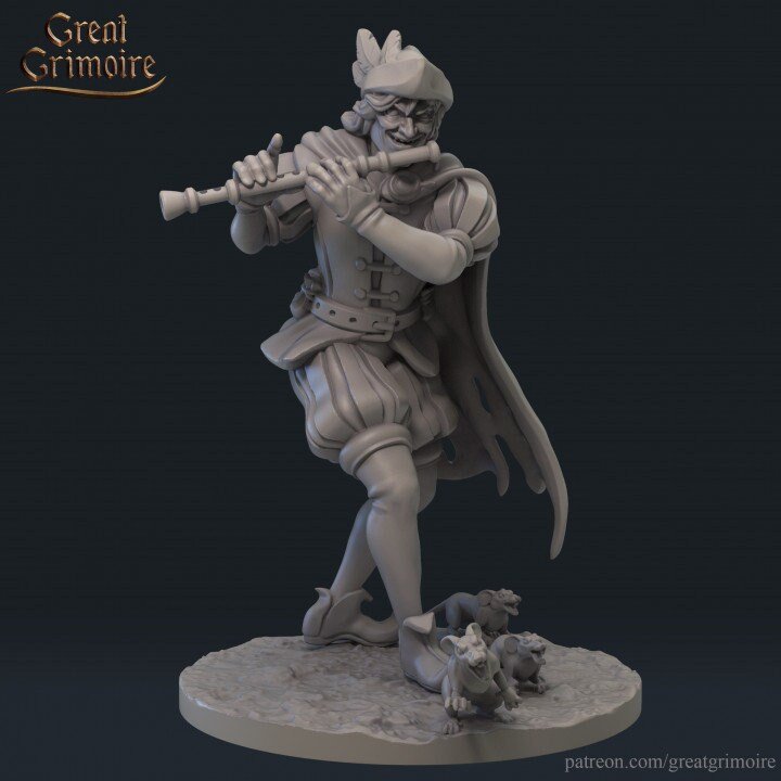 Great Grimoire Miniatures are printed in high quality, ABS Like Gray resin in order to provide a mixture of sharp details & quality. The miniatures are printed for 32mm Scale. Other sizes available. Base Included. All models are supplied unassembled & unpainted. This will be shipped in multiple pieces so additional sanding, priming, or line filling may be needed. Pictures & thumbnails are examples only & the final product may vary. Follow me on IG @ShooterMcgavinminiatures to see more actual prints of minis & minis painted! We are officially authorized to sell physical prints of the Great Grimoire Miniatures digital .stl files of this model can be purchased by joining the Great Grimoire Miniatures Patreon (at: www.patreon.com/greatgrimoire), or going to https://www.myminifactory.com/users/greatgrimoire. Pied Piper From “Grimm Tales” By Great Grimoire Miniatures Rpg