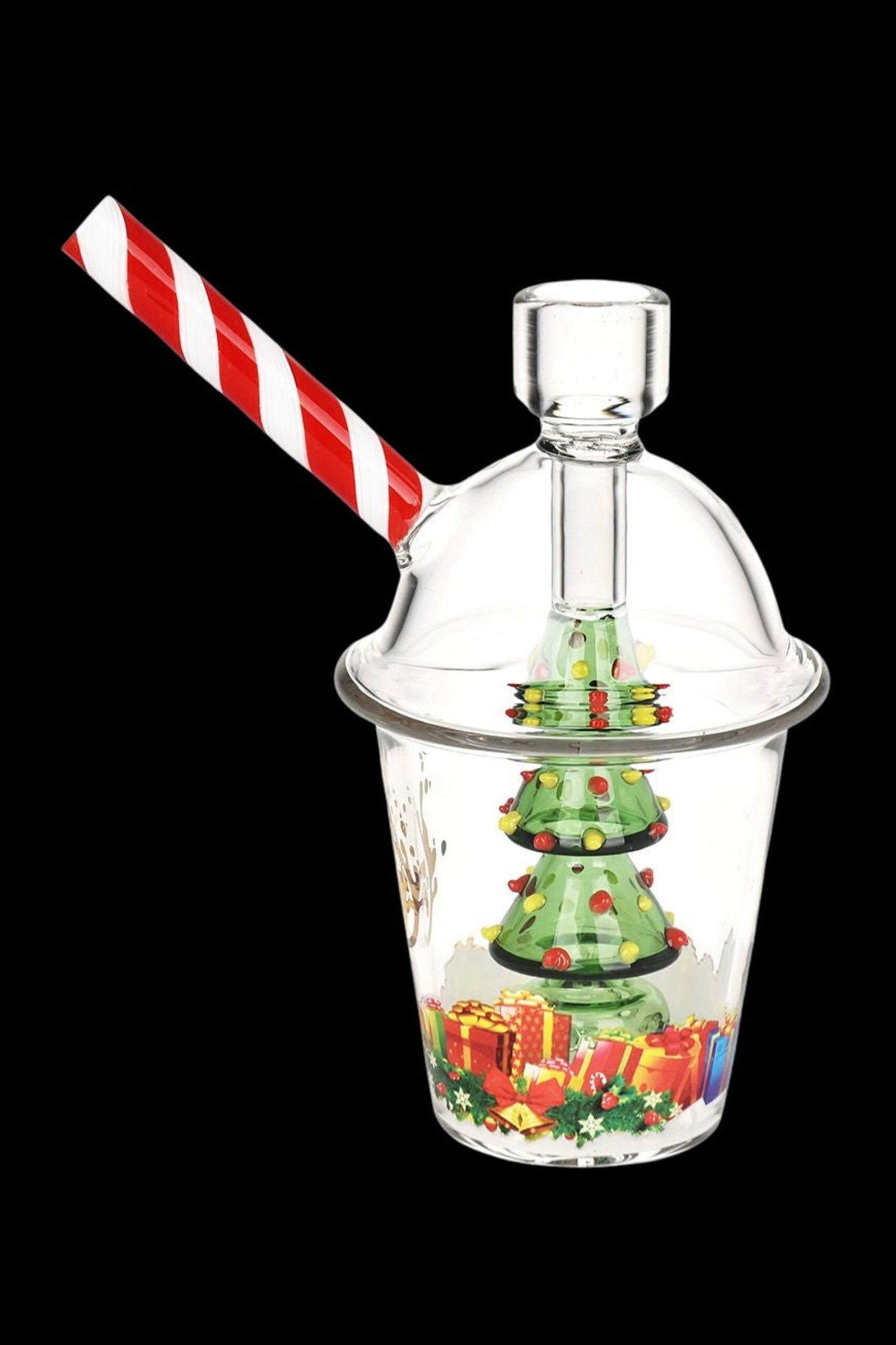 6 inches tall Bubbler hand pipe Novelty Christmas tree percolator Decorative presents decal design Slushie cup shape Fixed herb slide Angled straw mouthpiece Borosilicate glass Pulsar logo
