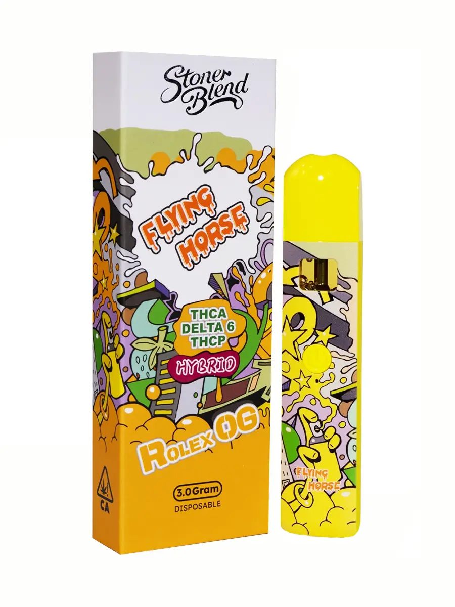 Key Features Cannabinoid Blend: Contains Delta-6 THC, THCA, and THCP, offering a potent and distinctive experience. Capacity: 3000mg: Provides a substantial amount of vape juice, ensuring prolonged use and enjoyment. Perfect for On-the-Go Use: Compact and portable design makes it ideal for vaping anywhere and anytime. Leak-Proof Design: Features a tightly sealed juice reservoir to prevent any leaking, ensuring a mess-free experience. Powerful Battery: Equipped with a powerful battery to ensure you can enjoy every last hit without interruptions. USB-C Rechargeable: Easily rechargeable with a USB-C connection, making it convenient and ready to use anytime. Delta-9 THC Compliant: Contains less than 0.3% Delta-9 THC, ensuring it complies with legal standards. Elevate your vaping experience with the Rolex OG Flying Horse Stoner Blend Disposable 3G. This device is designed for those who seek a potent and convenient option for their vaping needs. Enjoy the blend of cannabinoids, the leak-proof design, and the powerful battery that ensures you get the most out of every hit. Discover the future of vaping with the Flying Horse Stoner Blend. Order now from our online headshop, Olofly, and enjoy fast shipping and exceptional customer service.