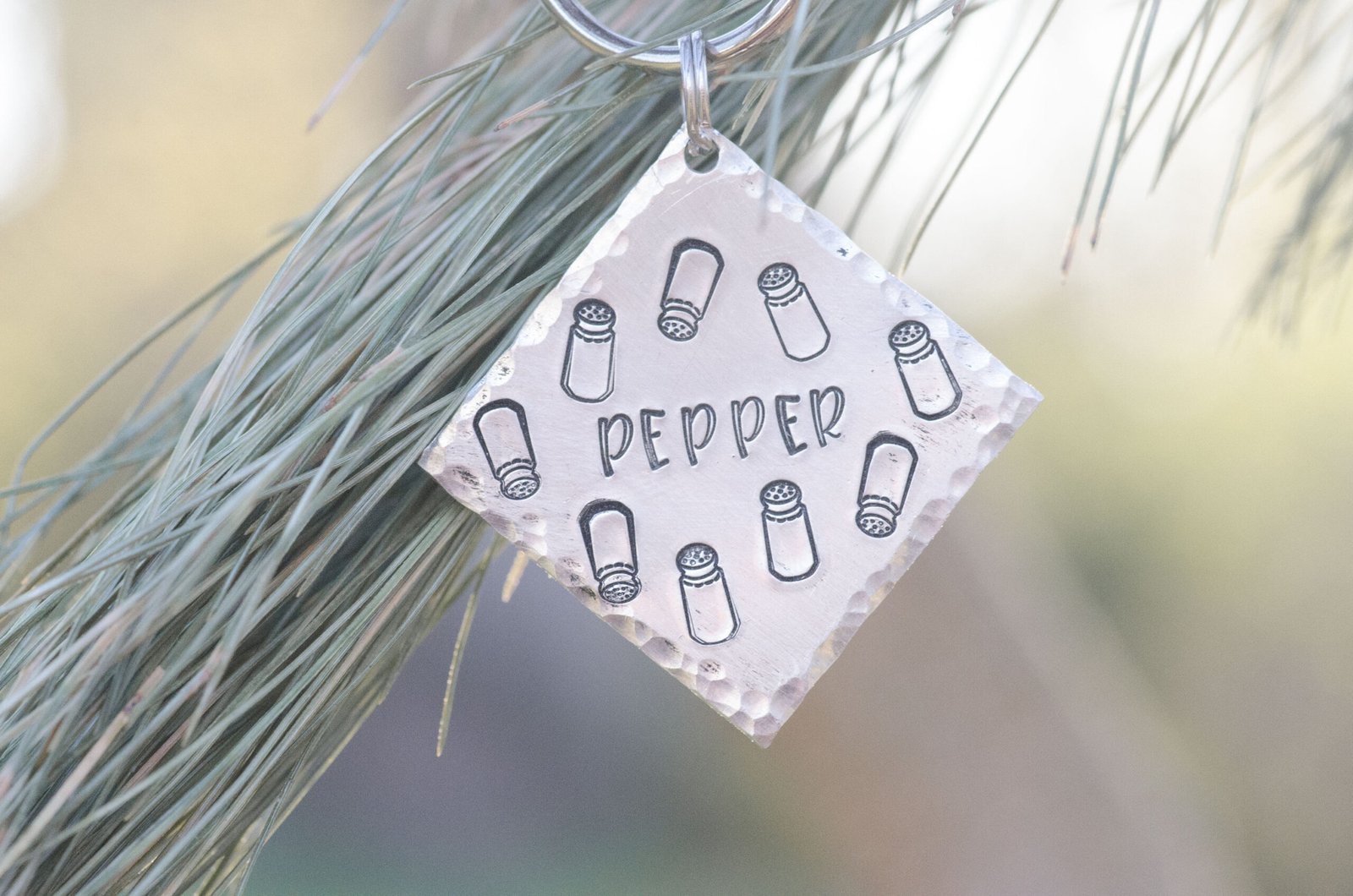 Hand stamped pet ID tag, personalized with your pets name on the front, & 1 or 2 phone numbers on the back. Shown in 1 1/4″ silver diamond with a hammered edge (included). Salt + pepper shaker pattern. Check out our other “peppers” listing called “hot & spicy” featuring spicy peppers & hot sauce bottles: https://www.etsy.com/listing/1072668247/hot-spicy-personalized-dog-tag-metal-pet?ga_search_query=pepper&ref=shop_items_search_1 If you need your order quicker, view our “rush processing” listing, & read the description fully before adding to cart. https://www.etsy.com/listing/885278508/rush-processing-read-description-add-ons?ref=shop_home_active_3&frs=1 If you want additional text, or an address on the back of your tag, purchase the add-on here after reading the full item description: https://www.etsy.com/listing/854685651/extra-text-add-on-only-read-item?ref=shop_home_active_1 Hardware upgrades available with tag purchase can be found here: https://www.etsy.com/listing/794213367/hardware-upgrade-add-on-wtag-purchase?ref=shop_home_active_2&frs=1&crt=1 Shakers, Personalized Dog Tag/Metal Pet Id Name Tag, Salt & Pepper