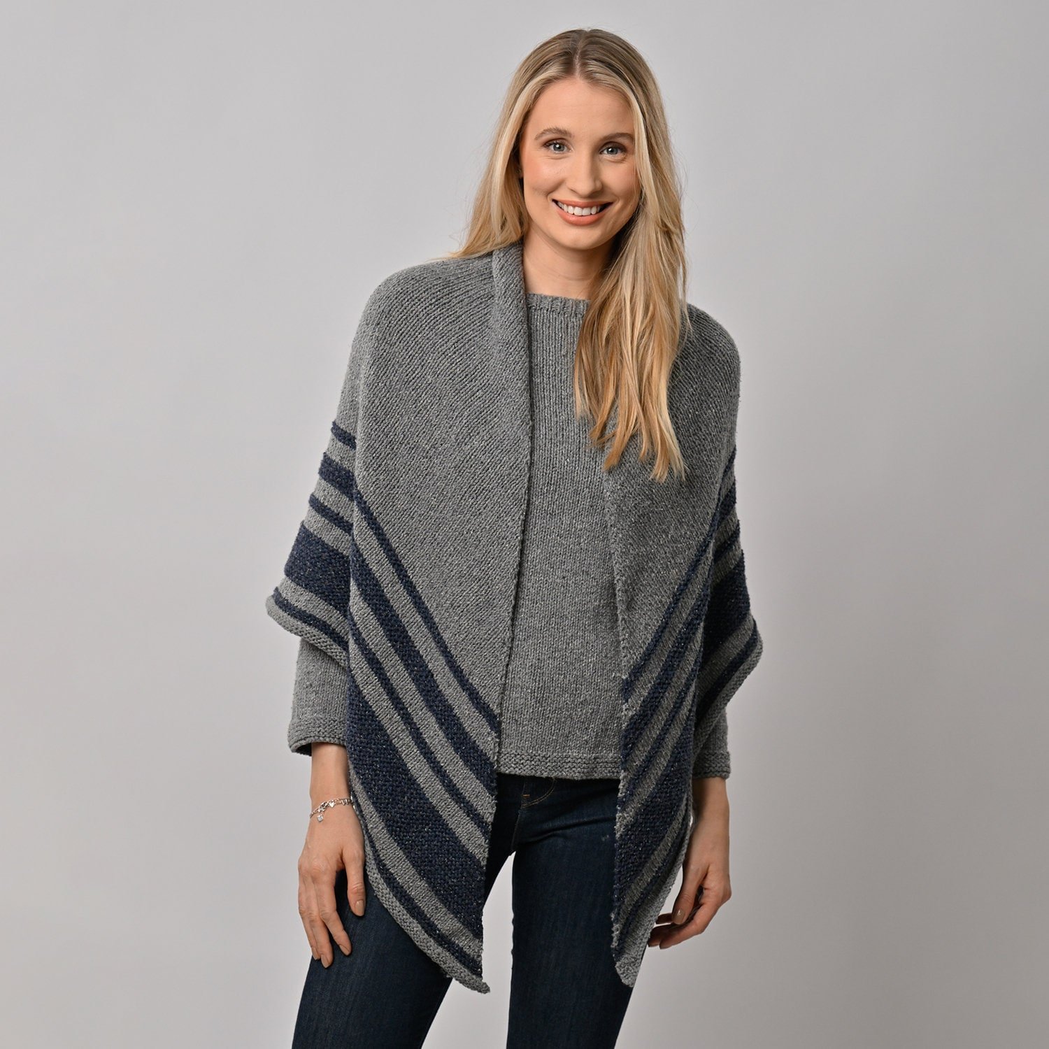 Summer Shawl knitting kit. This versatile & elegant shawl makes a great way to change an outfit. A staple fashion accessory that can style up any outfit. The Summer Shawl is a stylish accessory & a practical solution for staying warm during those cooler evenings. The Summer Shawl a must-have accessory for your wardrobe. Select your own colour combination from our machine washable Utterly Aran range. This is an ‘intermediate’ kit for the knitter who is confident with the knitting craft. Kit Contents: 6 x 50g of Utterly Aran Yarn (colour A). 3 x 50g of Utterly Aran Yarn (colour B). Summer Shawl knitting pattern. Darning Needle. SKU: K422 Optional: 5mm x 80cm circular knitting needles Skill level: Intermediate for the knitter who is confident in the craft. We have marked this project as “intermediate” due to the number of stitches on your knitting needles, rather than the complexity of the pattern. Stitches Used: Knit, purl & increasing stitches. Yarn Info: 28% Cotton, 28% Polyester, 20% Acrylic, 10% Silk, 9% Linen & 5% Other Fibres. 30 Degree Machine Wash Sizing: When completed, the Summer Shawl measure approximately 160cm, (63 ins) at the widest point & 110cm, (43.25 ins) at either side of the cast off edge of triangle. These measurements are when the Summer Shawl is laid flat & blocked out. The photographs show the Summer Shawl in Utterly Aran colours Grey Mist (colour A) & Ocean (colour B) yarns. Shawl Knitting Kit. Stole Knit Wrap, Oversized Scarf Craft Intermediate Kit