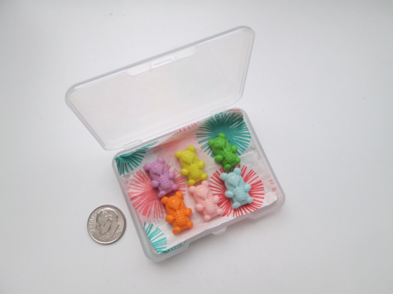 Hand sculpted from eraser clay, these skeleton gummy bear shaped erasers are both fully functional & decorative. Perfect for a collection, but also a functional eraser to remove pencil markings from paper as pictured. Skeleton Gummy Bear Erasers Novelty Fake Food – Set Of 6