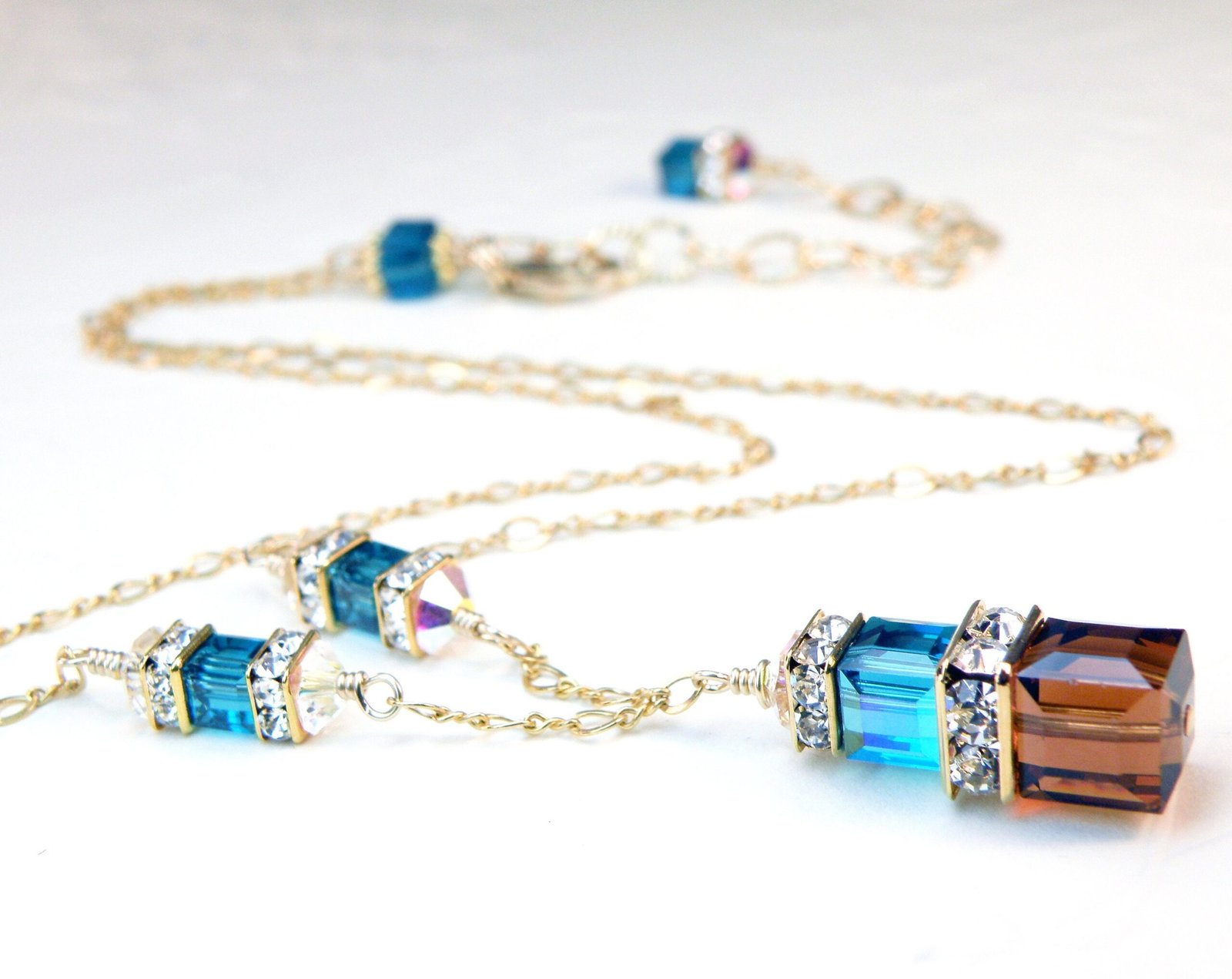 Teal & Chocolate Crystal Necklace, Gold Filled, Blue Brown Cube Bridesmaid Necklace Wedding Jewelry, Mom Anniversary Gift
