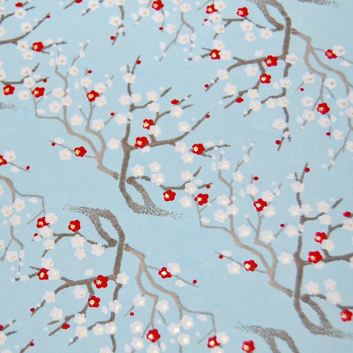 Two Japanese Chiyogami Yuzen Paper Sheets Red & White Blossoms, Sky Blue | 5″ X 4.25″