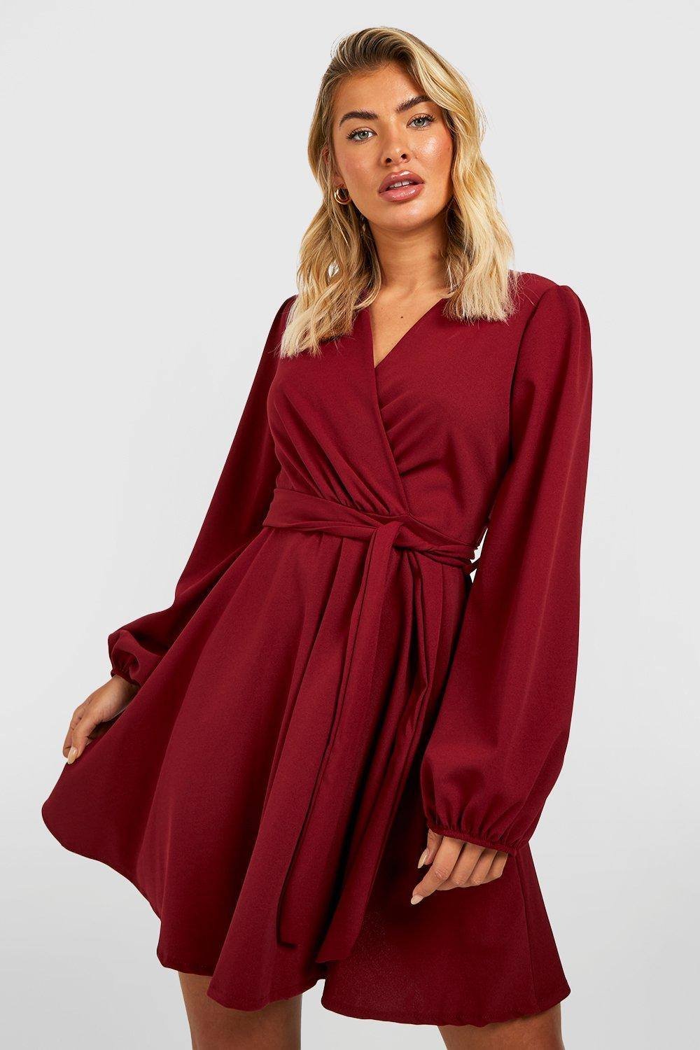 Womens Balloon Sleeve Wrap Mini Skater Dress – Red – 4 – Versatile, chic, and always effortless, wrap dresses are the wardrobe essential you don’t wanna sleep on this season, and this style is no exception. With a wrap design secured with tie detailing, this one is giving us all the vibes. Pair with cute sandals for off-duty days or opt for barely-there heels for Saturday night plans. From black wrap dresses to maxi styles, we’ve got something for everyone. Take it to daytime with our soft jersey numbers or check out our satin wrap dresses for a going out look with extra attitude. Discover everything from navy wrap dresses to playful printed options right here on boohoo.Style: Skater DressDesign: PlainFabric: Scuba CrepeLength: MiniNeckline: WrapSleeve Length: Long Sleeve