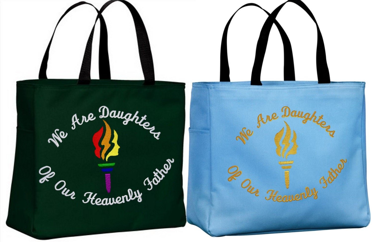 Beautiful Quality-Embroidered tote bag. Medium size has ample space for manuals & supplies for all your church needs & includes an interior & exterior pocket. Longer handles help balance the load on busy days. Custom embroidered with one of our stock designs, or let us design one specific to your needs. 600 denier polyester Large main section with small interior self-fabric pockets Left side exterior pocket Web handles Dimensions: 12’h x 14’w x 6.5’d, Approx. 1,092 cubic inches Note: Bags not intended for use by children 12 & under. Includes a California Prop 65 & social responsibility hangtag . Bag is available with the design alone, or have your name added for a small additional charge. Please include the name or title in the notes, as well as where you would like it added. If a name is added without instructions it will be automatically sewn on the opposite side of the bag from the design. All designs are available on the bag color of your choice (see color choices) & thread choices within the designs can be changed to your specifications. VOLUME DISCOUNTS are available for 10+ bags. Please send us a custom request in Etsy messages for this option. Young Women Embroidered Medium Size Tote Bag